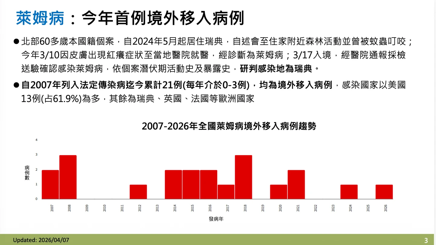 【記者賴昀岫/台北報導】國內新增今年首例萊姆病境外移入個案,為一名60多歲本國籍女性,感染國家為瑞典,3月中入境台灣後,出現血尿且皮膚症狀未改善,2度就醫後確診為萊姆病,目前已返家休養,是2007年以來第21例。