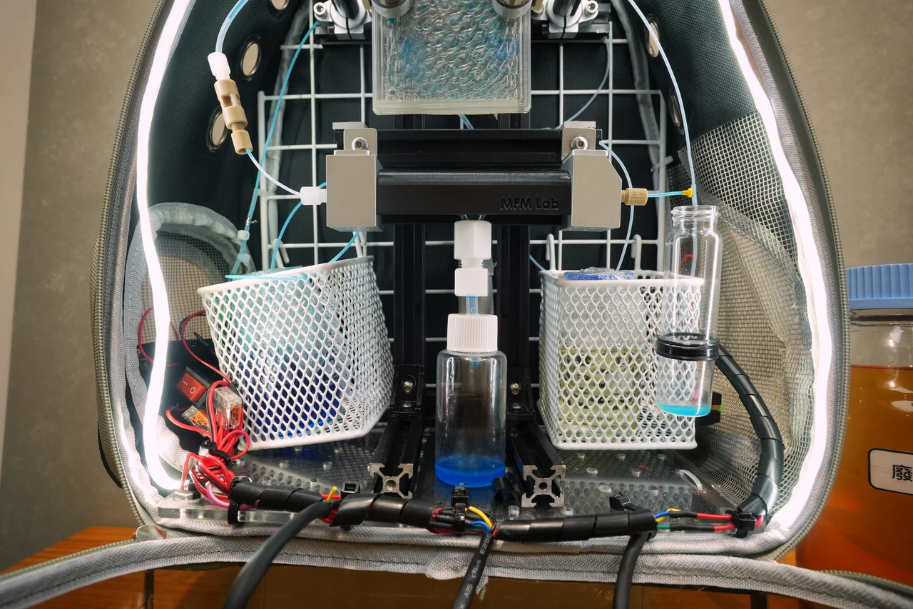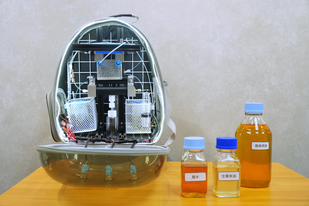 蔣雅郁團隊所開發的小型生質柴油生產系統,僅有背包大小,甚至能裝設在寵物背包當中,攜帶、使用都相當方便。