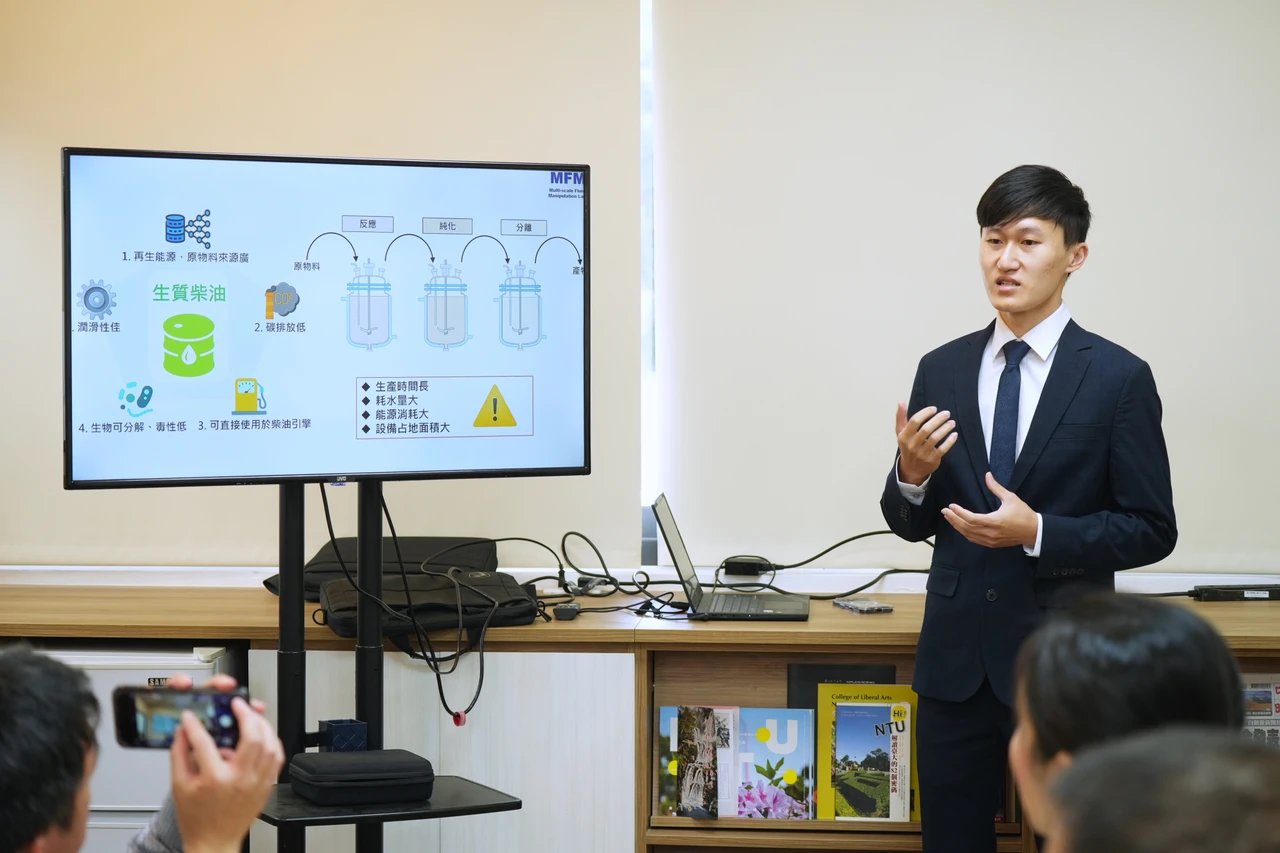 台大機械系博士班學生楊承祐介紹,生質柴油是一種環保、可再生的能源,原料來源廣泛、碳排放量低,也具備生物可分解、毒性低的優勢,傳統製造方法是批次生產,耗費時間長,且要消耗大量的水、能源,設備佔地也相當大,而這項小型生質柴油生產系統,可以隨時隨地、連續不間斷地生產,僅需要廢食用油、植物油等,就可生產出生質柴油,生質柴油能用於發電機等設備使用。