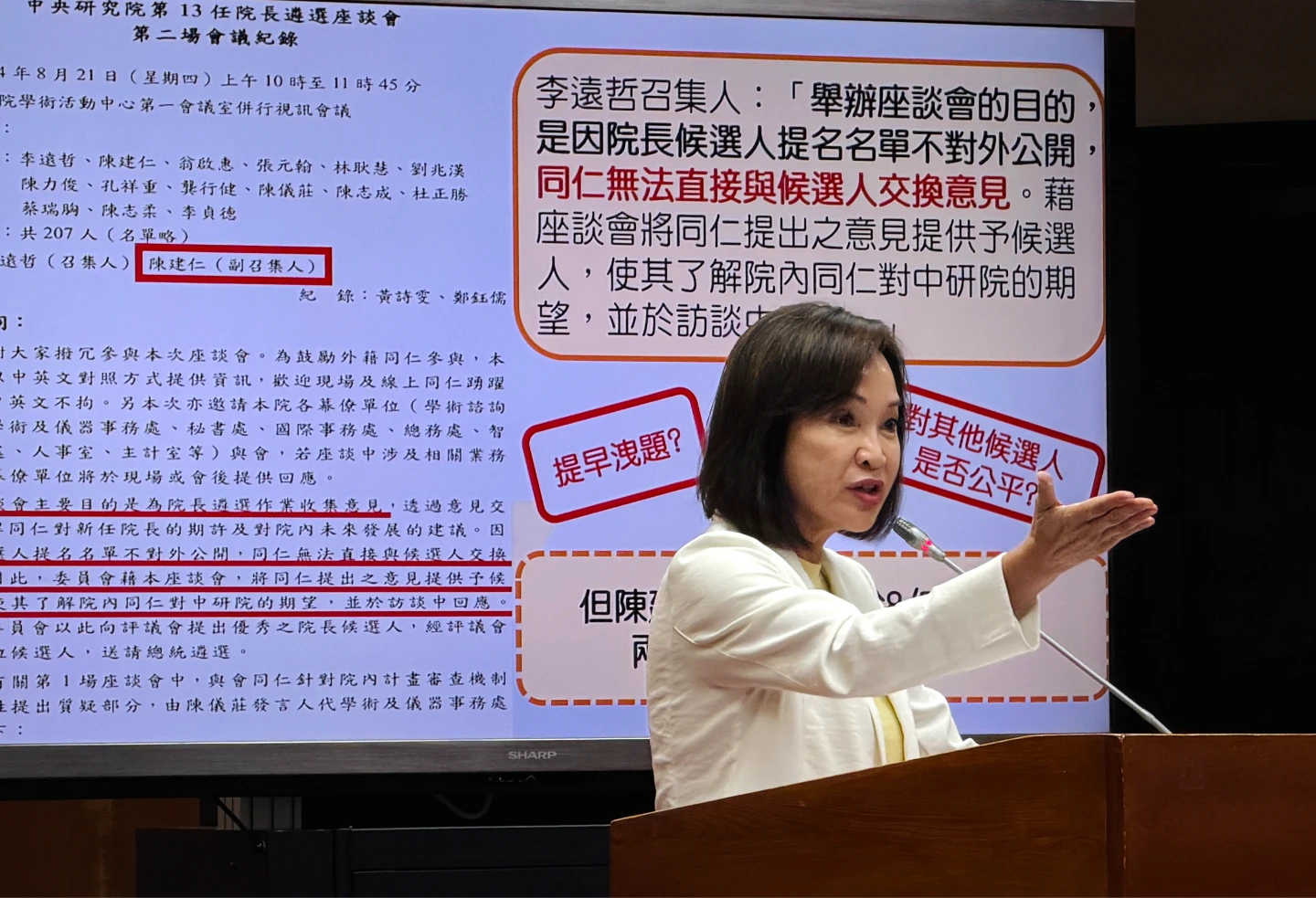 陳儀莊說,「對於陳院士是不是候選人不能告訴您」,但所有問題都是之後決定的;柯志恩指出,院士當然德高望重、學術經驗多,但這是程序問題,如果陳真的是其中一名候選人,已在8月了解同人的期許,比其他3位候選人都更具競爭力,建議要訂定規則,有可能成為候選人就不該成為遴選委員,雖無違法但影響到公平興和社會觀感。