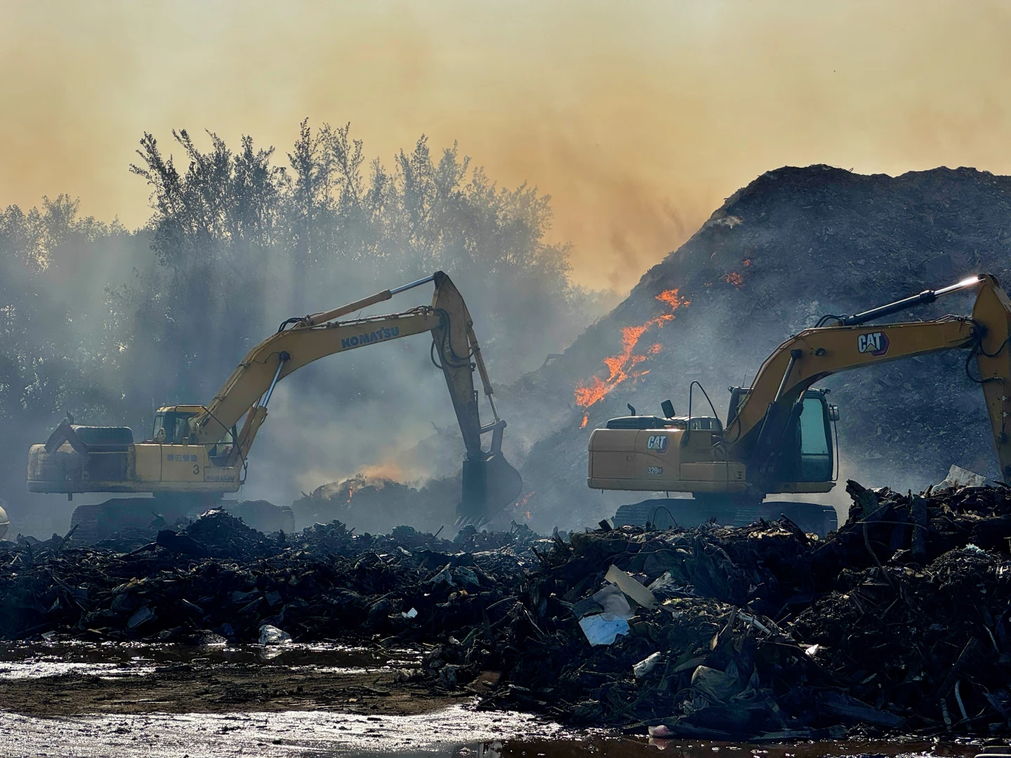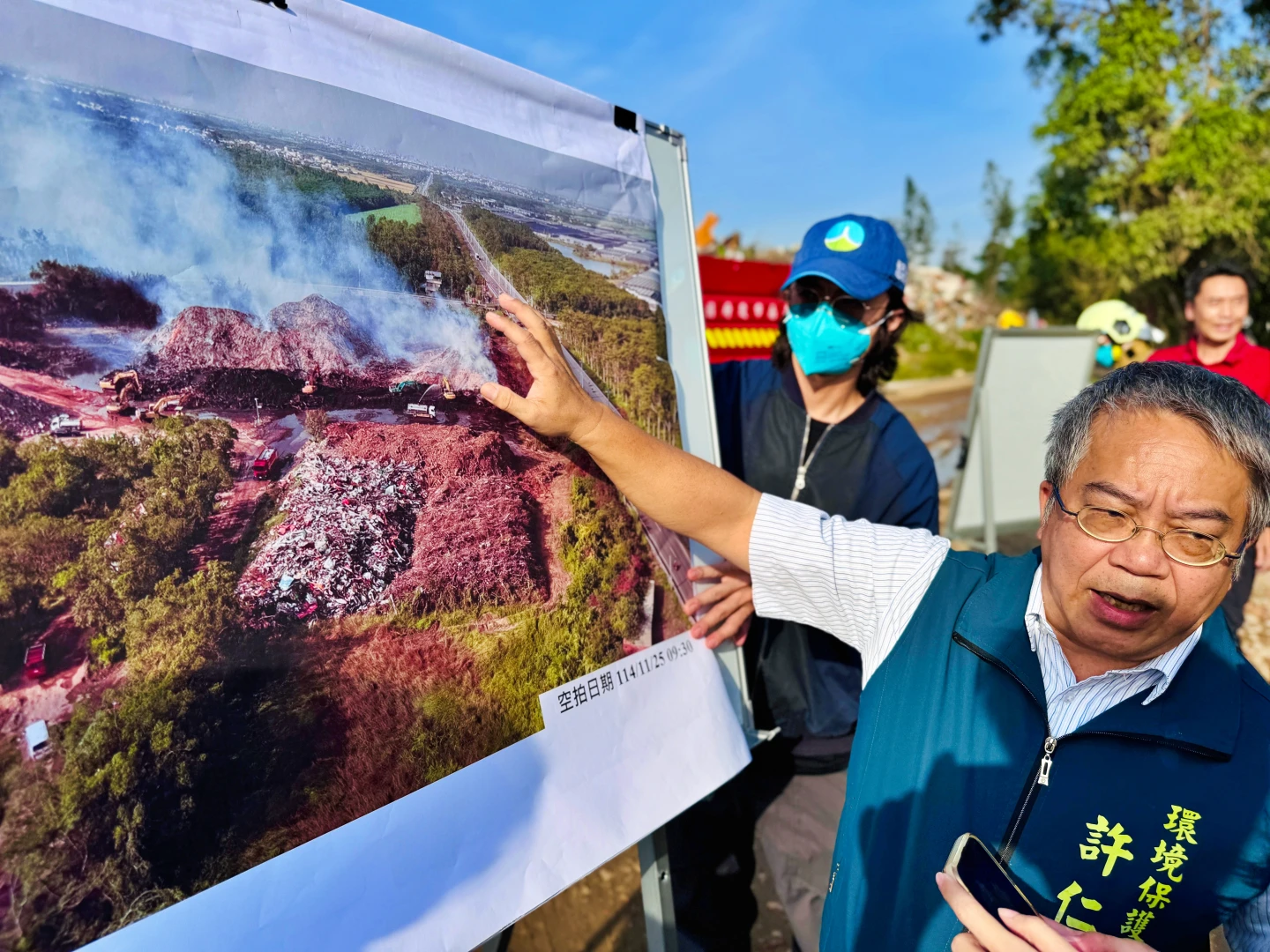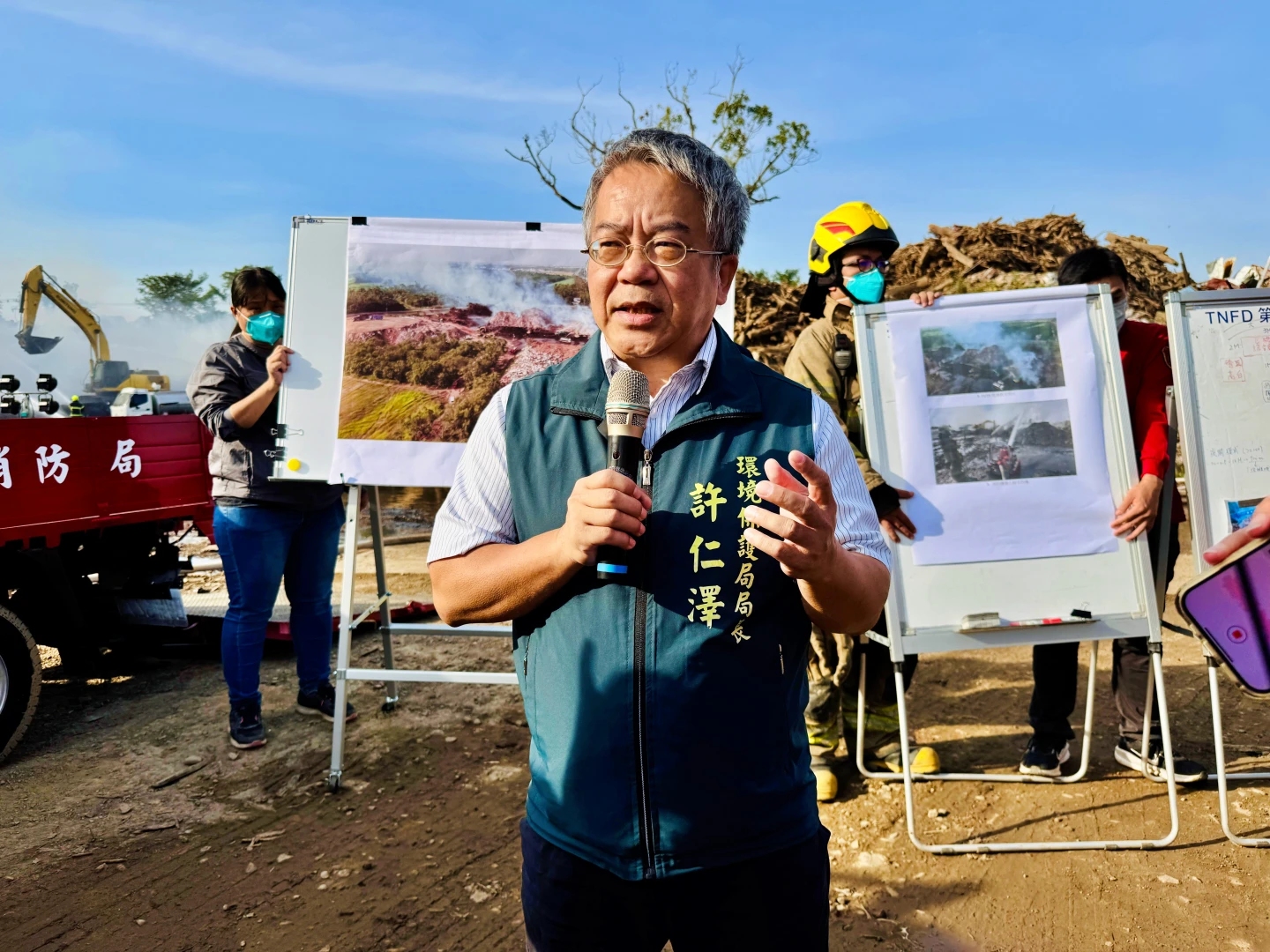 針對外界抨擊處理緩慢,環保局長許仁澤今天下午再度前往火場說明,強調火場一度高達21公尺,現場24小時不斷開挖、降溫、移置,據今天空拍顯示已明顯降低,未來將協調水利局支援,透過引水淹沒火場底部,加速作業,希望能搶在10天處理完畢。