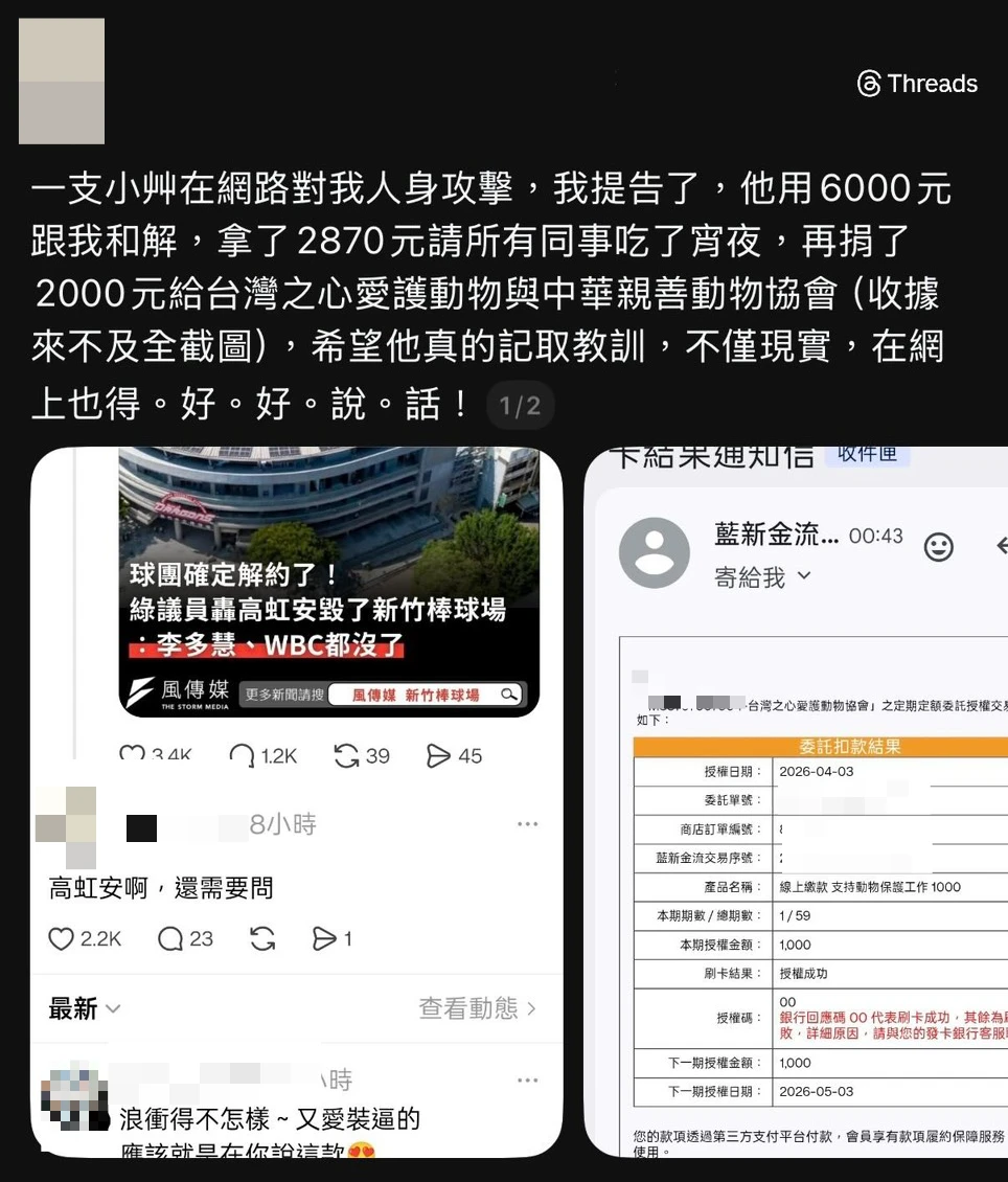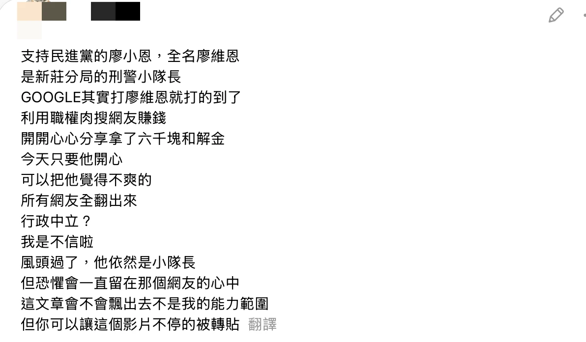 另篇則以「大家敲碗的和解書這不就來了」開頭,點名就跟柯文哲案一樣有起訴書、判決書,並說,有的人問他為何流程那麼快,他稱因遇上認真的警察,還在文末貼出和解書、刑事撤回告訴狀引發網路論,有網友肉搜出他有警職身份,被質疑違反行政中立。