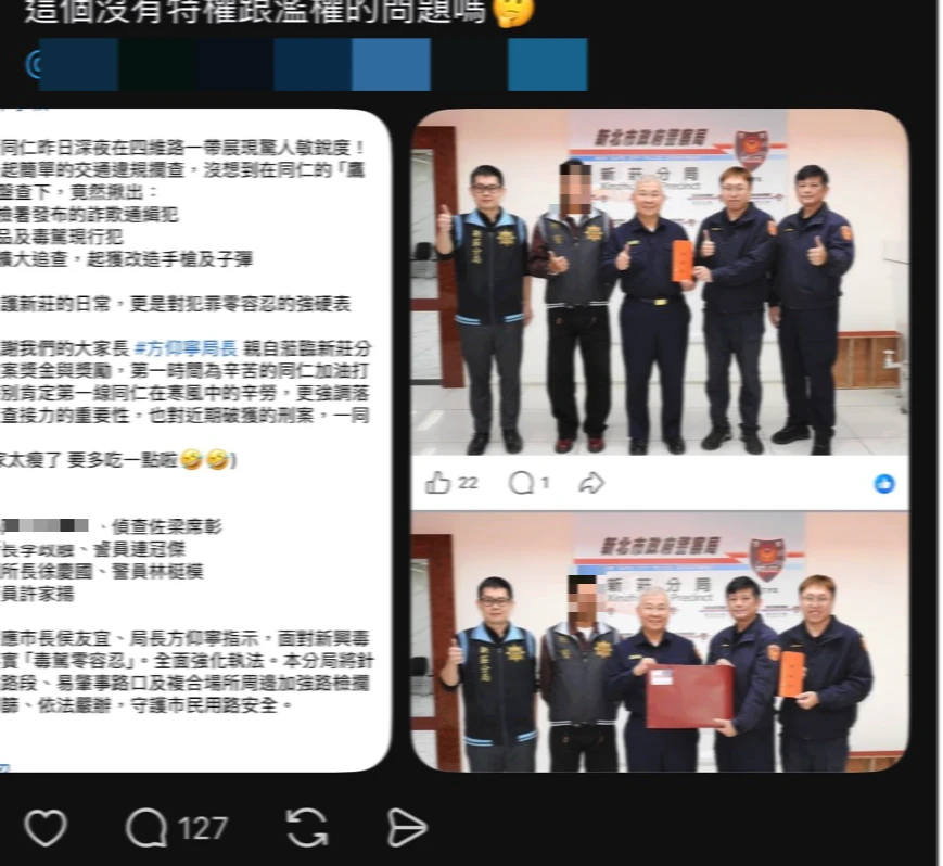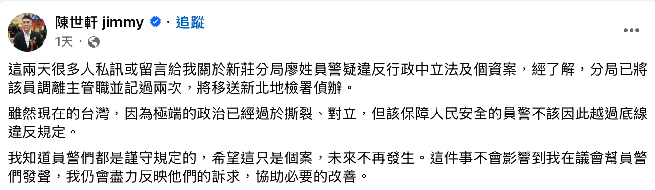 新莊警分局督察組長黃聖博表示,有關本分局廖姓員警疑似網路發言不當,遭網友質疑有違反行政中立及濫權偵辦等情事,經查廖員所獲和解金有捐贈處理,惟過程中恐違反《個人資料保護法》及《公務員服務法》利益迴避之嫌,核予廖員記過二次處分、調整為非主管職務,另依法移送新北地方檢察署偵辦。分局持續宣導所屬,嚴守行政中立,恪遵相關法令,避免衍生爭議。