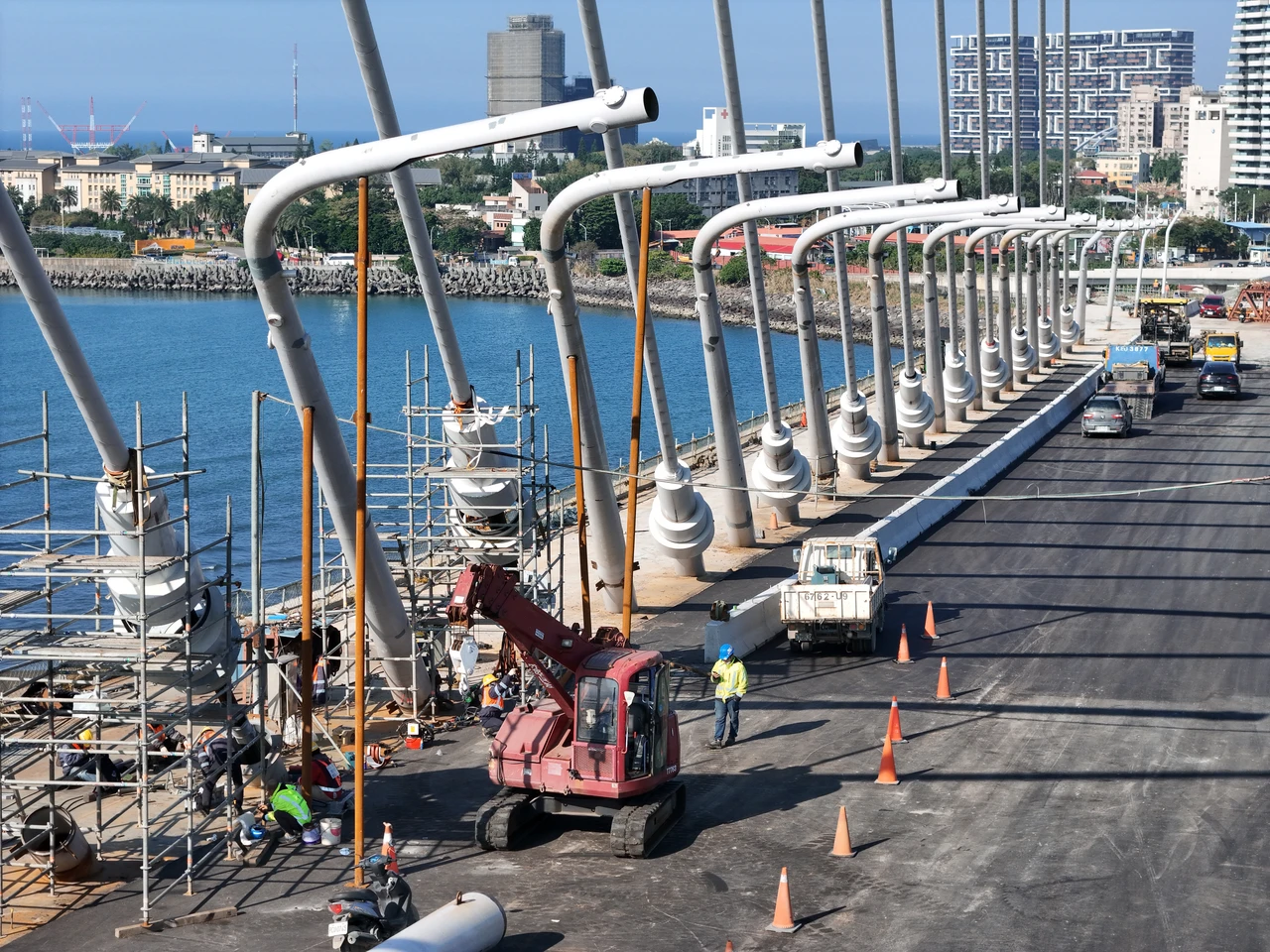 【記者陳怡文/台北報導】國內重要地標工程淡江大橋即將於115年5月12日完工通車,在114年9月16日正式合龍,橋體全線貫通後,為了完善整體橋梁結構安全,提升行車舒適度,淡江大橋刻正進行三亮點工程,包含94條斜索阻尼、126支景觀燈柱的安裝及高性能GUSS瀝青的鋪設等作業。
