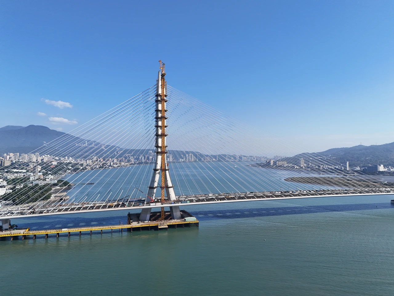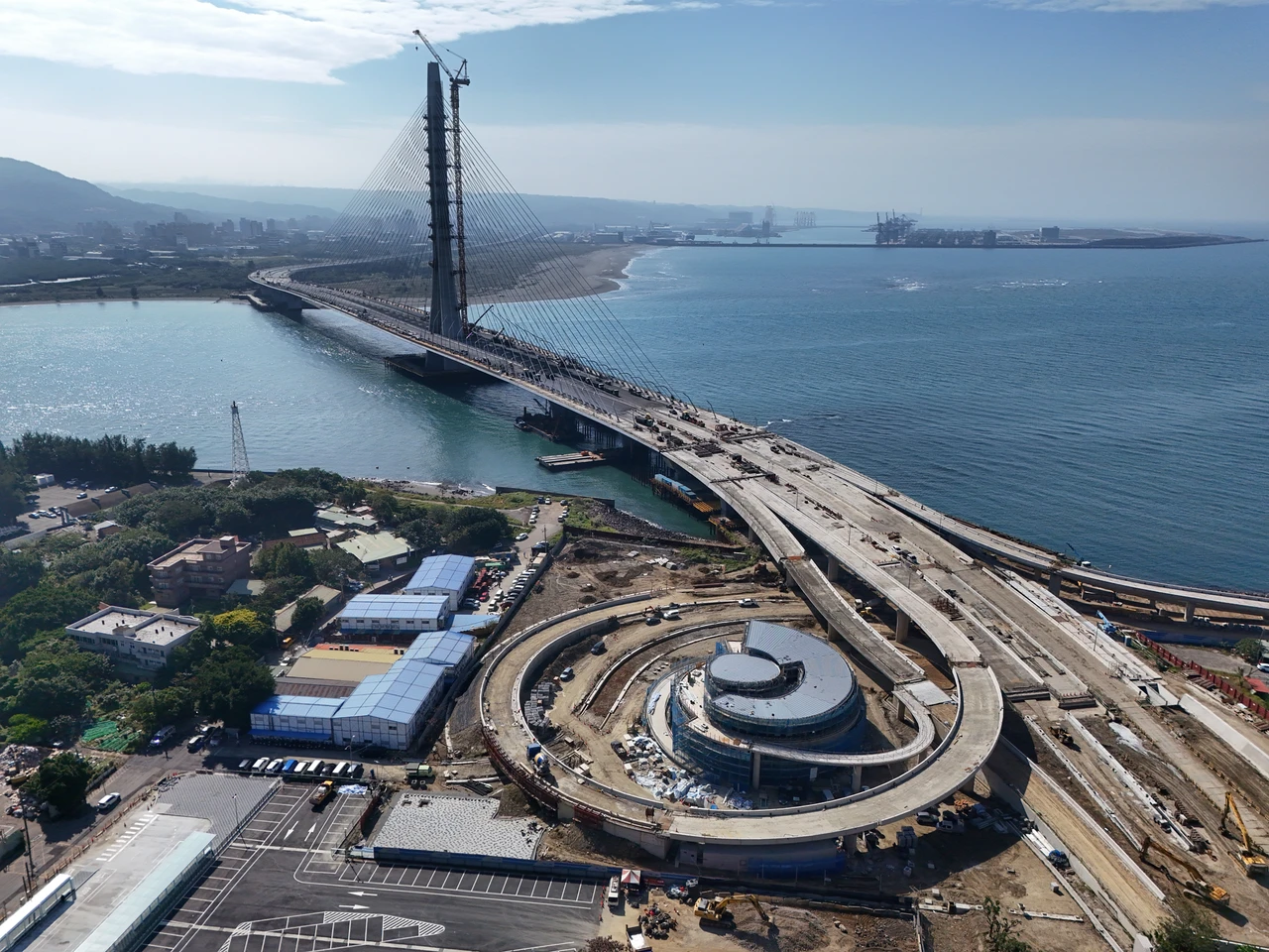 並克服橋塔曲面造型、河口強勁風速、超高層作業,歷時2年8個月於114年9月9日完成,100公尺以上高空風速大於10m/s須停止作業,塔吊逐桶澆置混凝土12小時以上,兩班制日夜趲趕進度,白天模板組裝、晚上鋼筋綁紮。