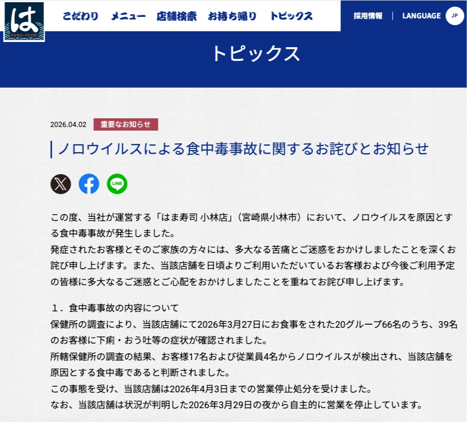 濱壽司4月2日在官網發布致歉聲明,坦承旗下在宮崎縣小林市的分店日前發生諾羅病毒食物中毒事件,對此深表歉意。