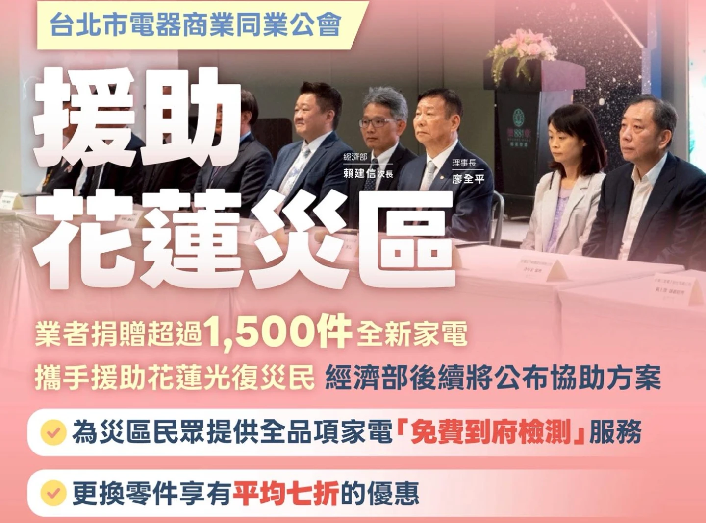 【記者吳珍儀/台北報導】花蓮地區受災後,經濟部聯合電器公會發起送暖行動。電器公會號召25家業者,宣布將捐贈超過1,500台生活家電,包括洗衣機、冰箱與電扇,協助災民在清理家園後,能夠儘早恢復日常生活。經濟部表示,後續將與業者研擬並公布具體發放方案。