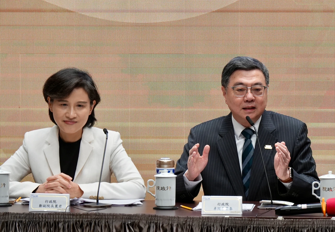 行政院長卓榮泰(右)與副院長鄭麗君出席臺美關稅談判說明記者會。梁建裕攝
