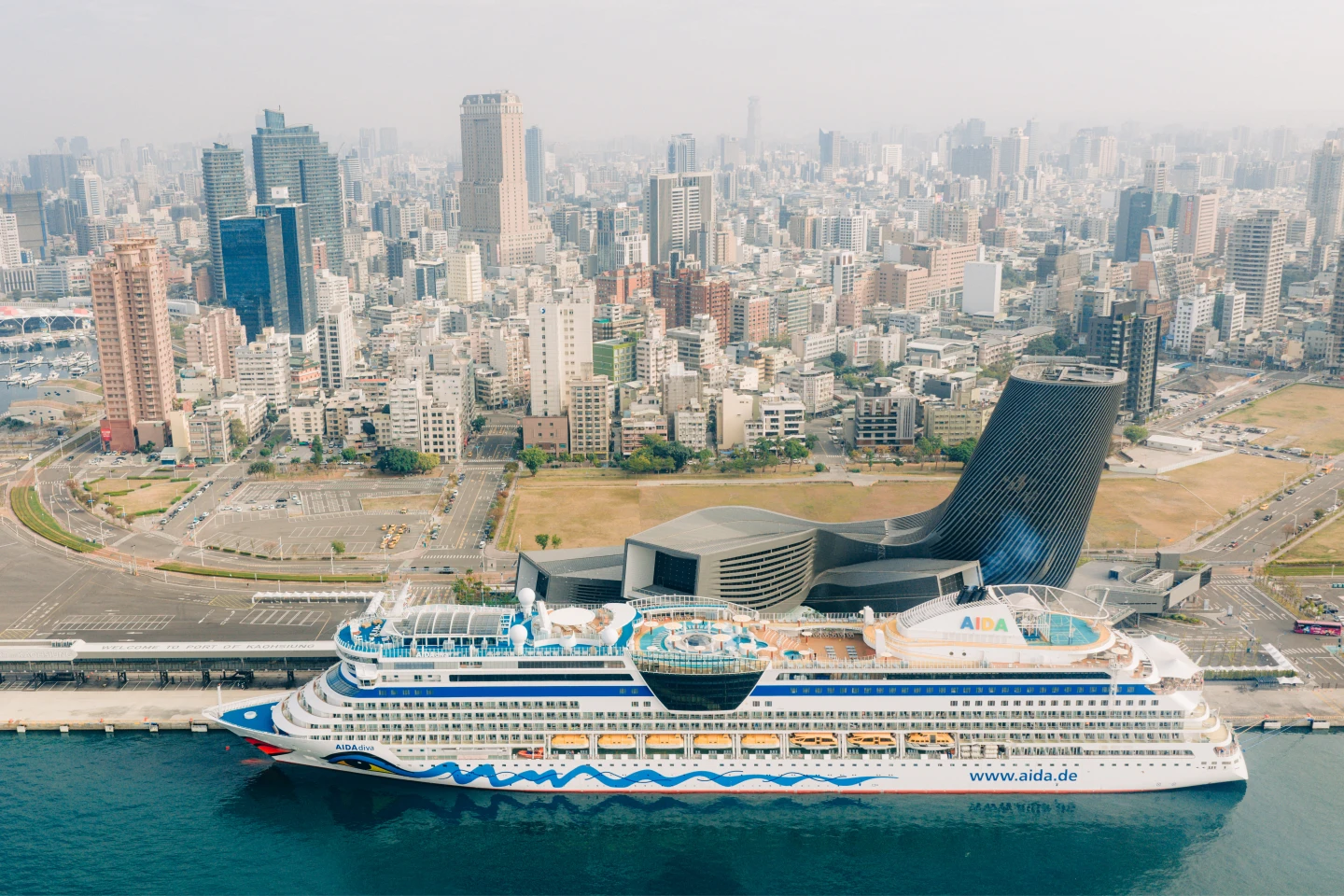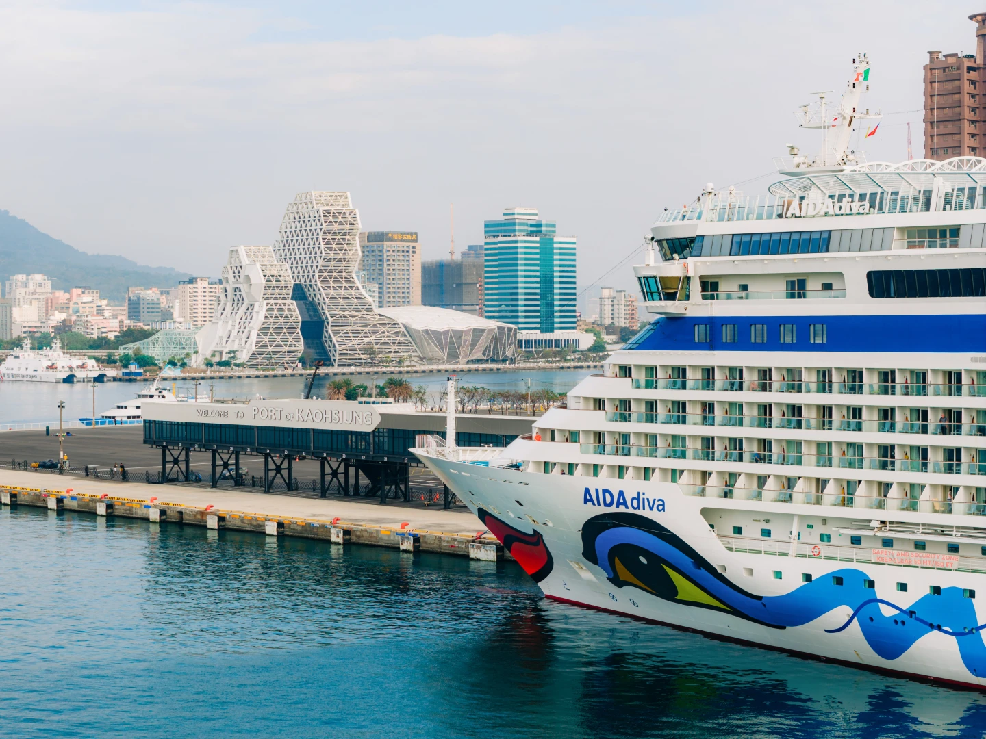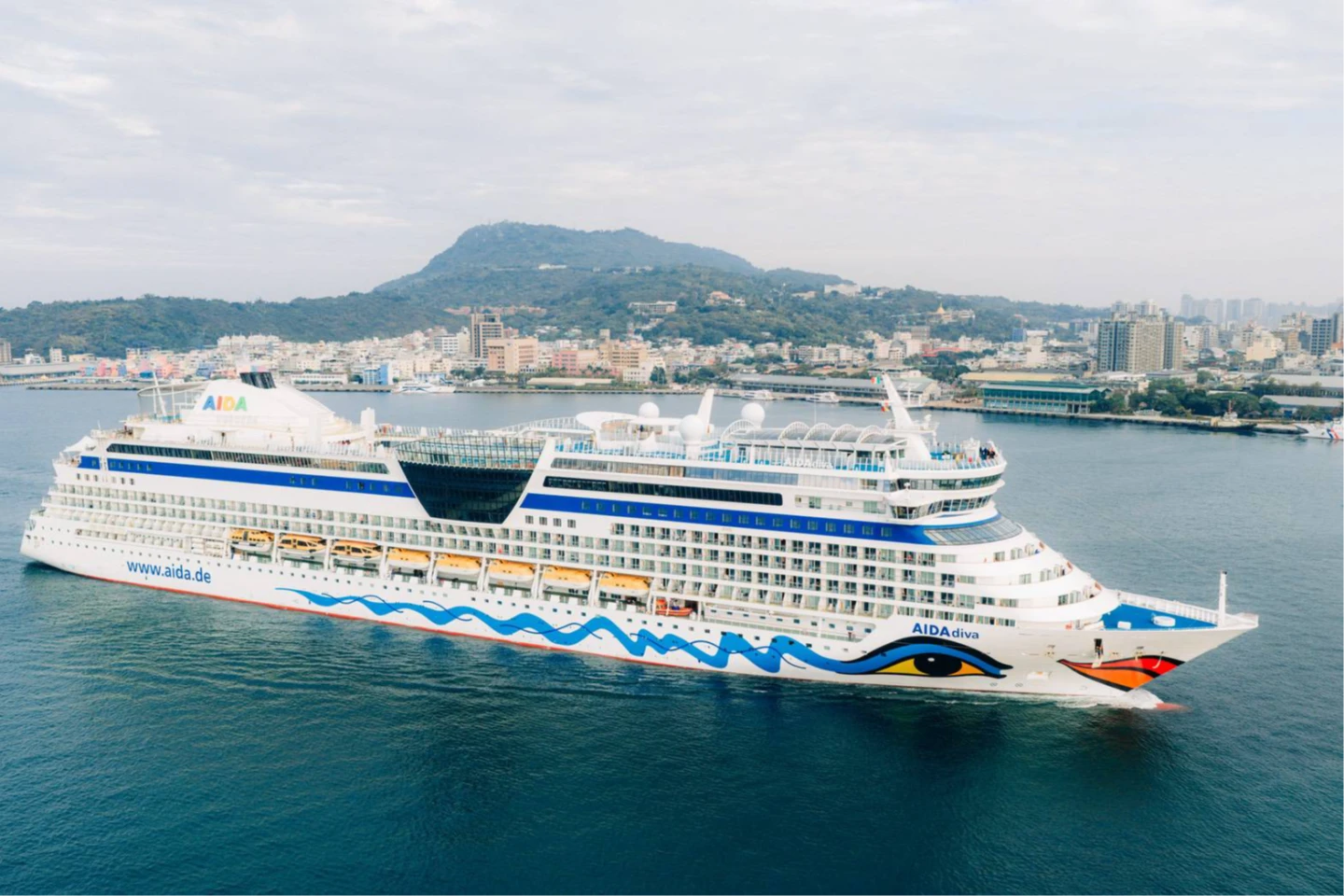 「愛達女神」初次亮相高雄港,船身以俏麗的藍眼睛與紅嘴唇彩繪吸引眾人目光,成為港區矚目焦點。該船總噸數6.9萬噸、船長252公尺、船寬32公尺,可搭載2050名旅客。