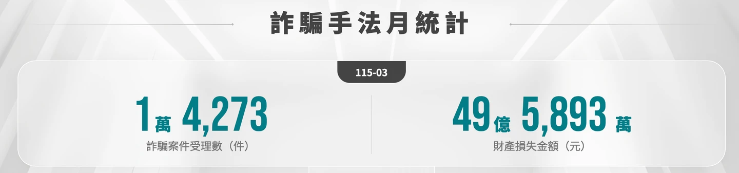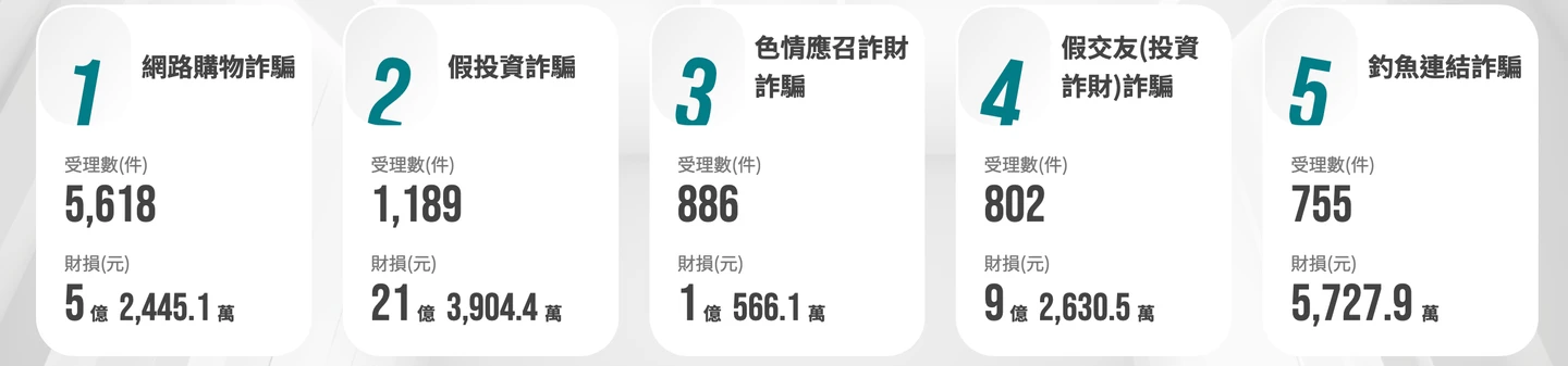 根據刑事局「165打詐儀錶板」統計,截至今年3月底,共受理1萬4273件詐騙案件,財損49億5893萬。以詐騙手法分析,詐騙最多是「網路購物詐騙」,共受理5618件、財損5億2445.1萬元,其次為「假投資詐騙」共受理1189件、財損21億3904.4萬元,第三為「色情應召詐財詐騙」共受理886件、財損1億566.1萬元,第四為「假交友(投資詐財)詐騙」共受理802件、財損9億2630.5萬元,第五「釣魚連結詐騙」共受理755件、財損5727.9萬元。