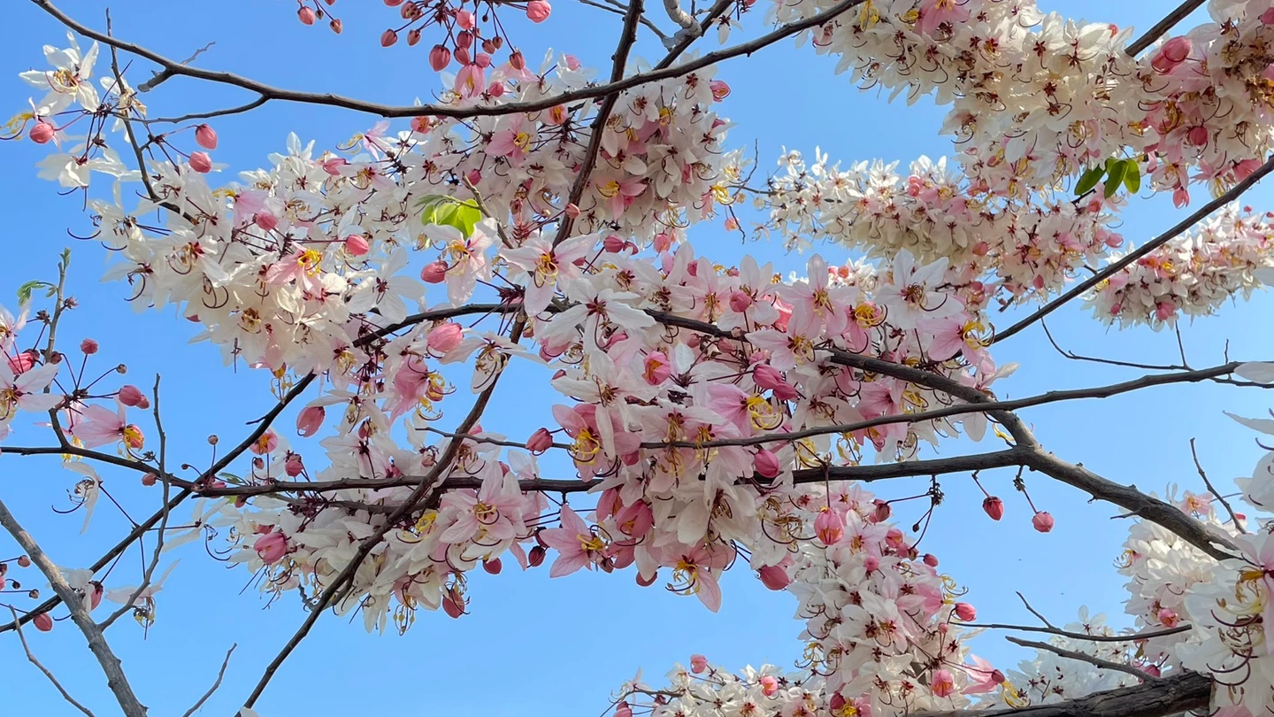 中華醫大指出,雖然今年部分植栽因受損導致花道不如往年密集,但盛放時的粉嫩姿態,依然吸引人潮尋幽探勝。每當下課鐘響,便能見到師生相偕跨過便橋,漫步花海底下合影,美不勝收的景緻也透過社群平台迅速傳播,成為熱搜焦點。