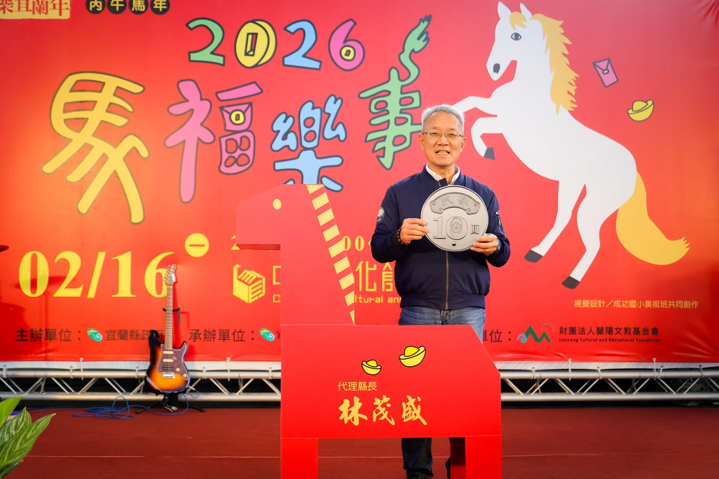 宜蘭縣代理縣長林茂盛表示,「2026歡樂宜蘭年」已邁入第33年,是宜蘭縣凝聚常民生活的與節慶精神的重要活動,今年主視覺以「馬福樂事」為主題,是由成功國小美術班學生共同創作,透過孩子的創意與藝術能量,以繽紛色彩與活力奔騰的白馬,代表勇氣、前進與突破。