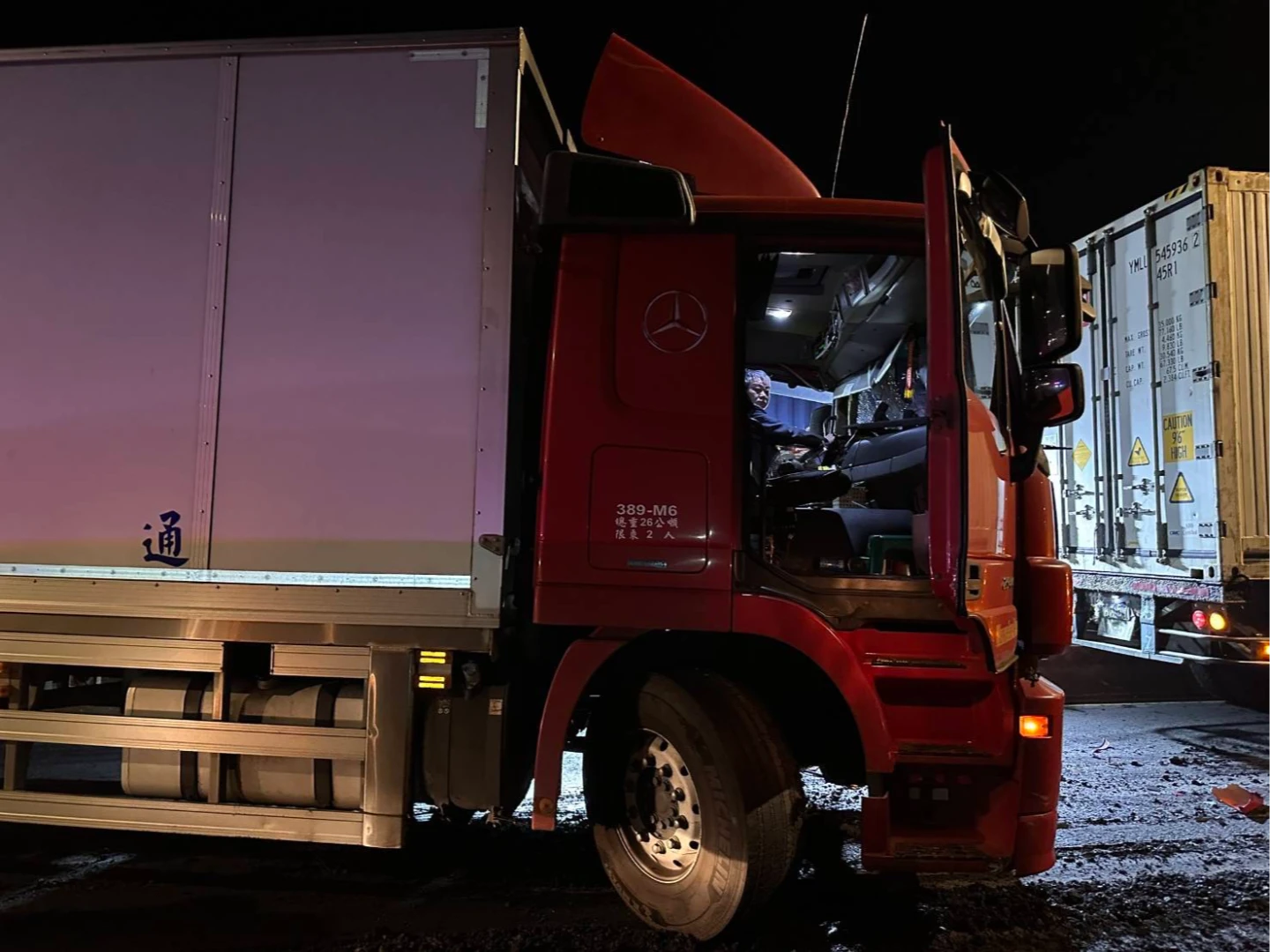 據悉,簡姓男子(54歲)今天凌晨4時43分左右,駕駛一輛曳引大貨車沿著新北市貢寮區台2線往宜蘭方向直行,途中行經台2線99公里處,不明原因打滑人車往中央分隔島衝去,旋即衝到對向車道,與對向林男(29歲)所駕駛的貨櫃車發生對撞,後車2輛貨櫃車及大貨車煞車不及也撞上,造成4車事故。