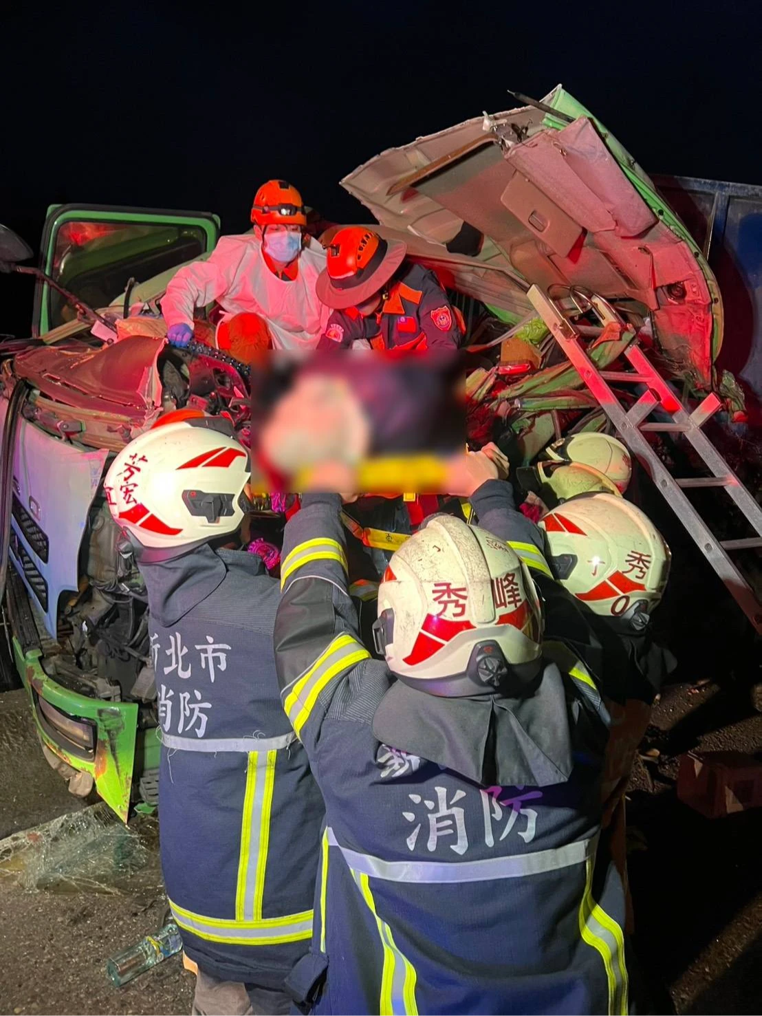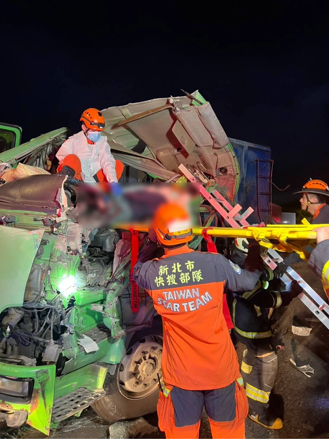 事故當下曳引車駕駛簡男一度受困車內無法動彈,消防局獲報出動人車趕抵,以破壞器材協助簡男脫困,檢視現場簡男已當場死亡,遭對撞的林姓男駕駛則肢體輕微撕裂傷,緊急送醫急救沒有生命危險。