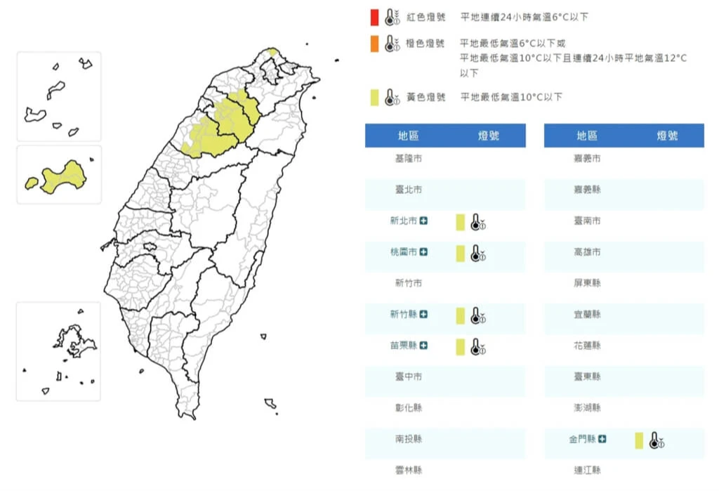 氣象署今天近午針對新北市、桃園市、新竹縣、苗栗縣及金門縣等5縣市發布「黃色燈號」,局部地區有機率出現10度以下低溫。北部與宜蘭整天濕冷,高溫僅18、19度,中南部早晚溫差大,提醒民眾注意保暖並留意空曠地區低溫。