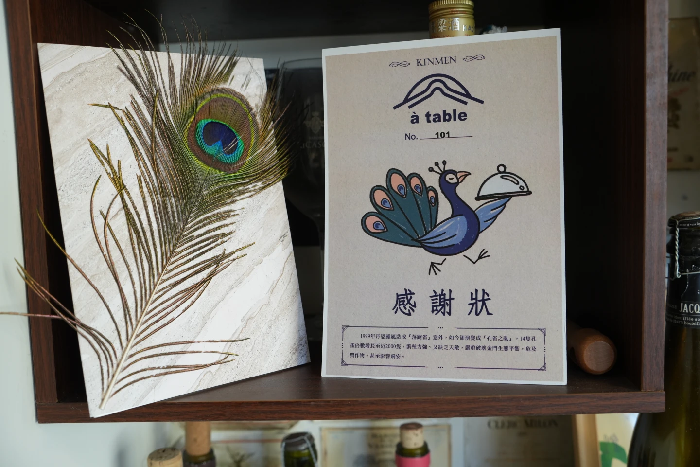 「樸食 À table」的孔雀宴是用一整隻孔雀,以不同手法料理成多道美食,吃完之後,還可獲得列有編號的感謝狀跟孔雀羽毛,作為紀念。