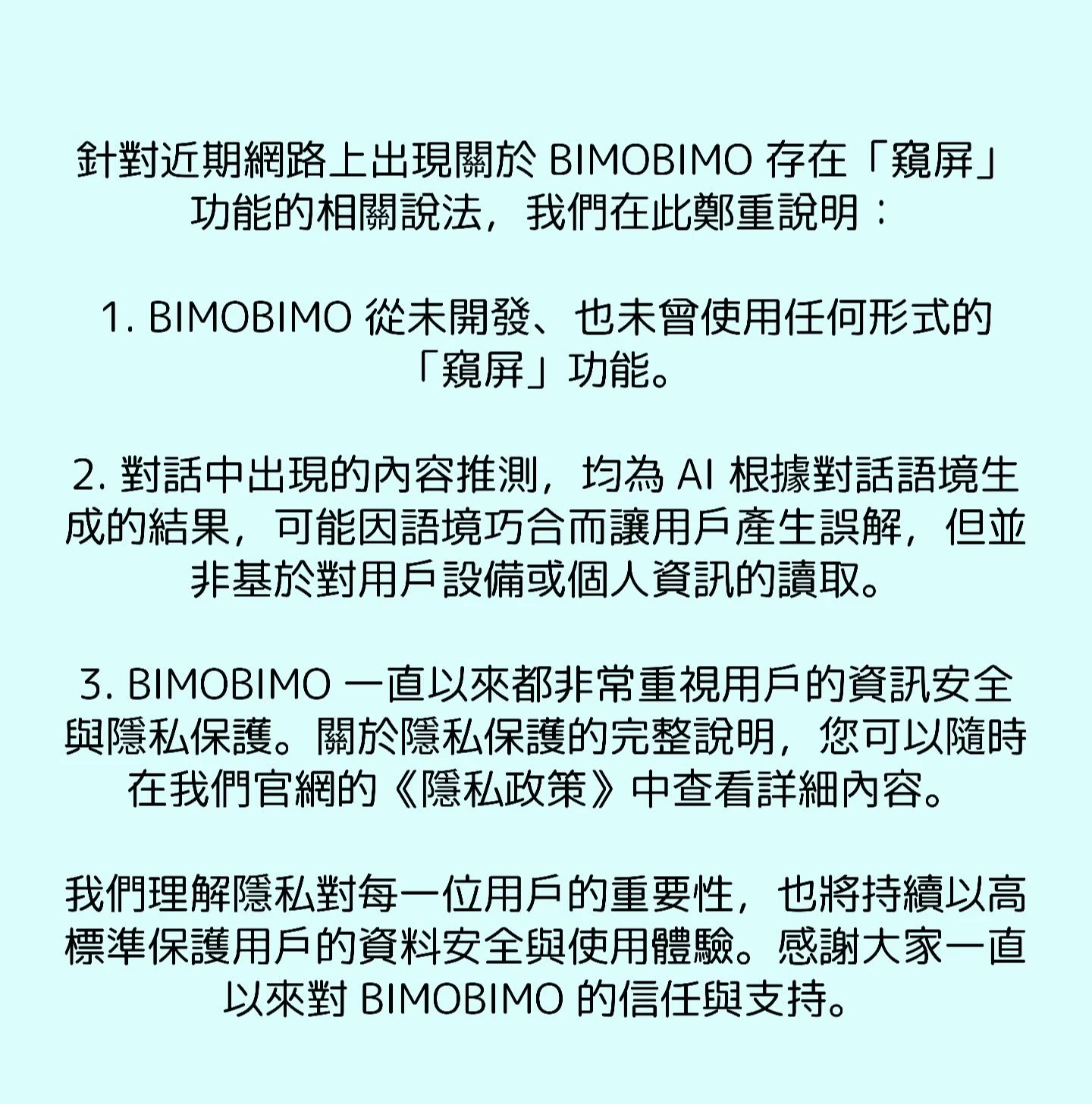 針對「窺屏」爭議, BIMOBIMO 發文鄭重說明,強調「BIMOBIMO 從未開發、也未曾使用任何形式的『窺屏』功能。」