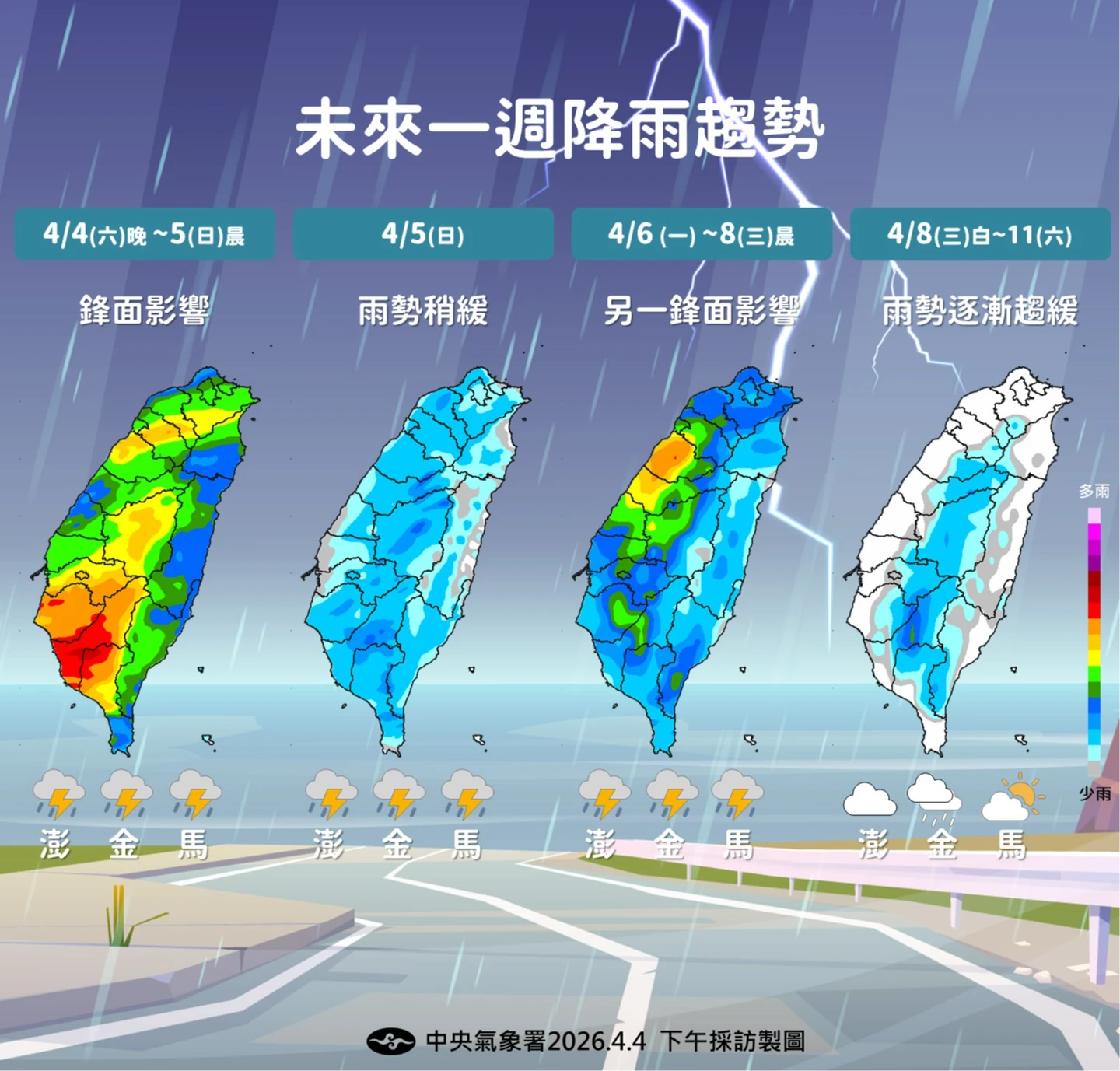 氣象署指出,隨著鋒面結構逐漸變差,今各地降雨已較昨日趨緩,但環境不穩定,各地仍有局部短暫陣雨,尤其是南部地區仍有機會出現局部雷雨。由於環境風場轉為偏南風,白天氣溫明顯回升,新竹以北及宜花東高溫約 25至27°C,苗栗以南可達 29至30°C。