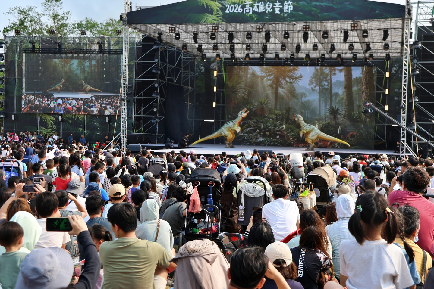 【記者王志弘/高雄報導】2026高雄兒童節「恐龍酷樂園」今天在衛武營震撼登場!首度來台的日本DINO-A-LIVE團隊帶來擬真恐龍精彩表演,瞬間將綠地變身史前大草原,吸引大批親子湧入,在歡笑中探索演化奧秘,氣氛熱鬧滾滾。活動叫好又叫座,將展至4月6日。