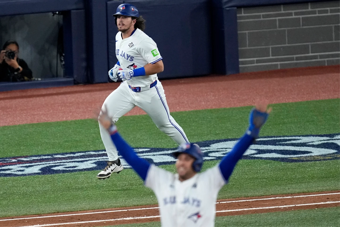 不過落後的藍鳥在4局下瓦修(Daulton Varsho)敲出追平比分的2分砲,5局打完兩隊戰成2比2平手。6局下史奈爾續投卻出現亂流,先是四壞保送、被敲安,再投出觸身球保送,留下無人出局滿壘危機退場,道奇頻換投卻擋不住藍鳥猛攻,巴傑爾(Addison Barger)代打敲出滿貫砲將比分擴大至9分差,也成為世界大賽史上第一支代打滿貫砲。