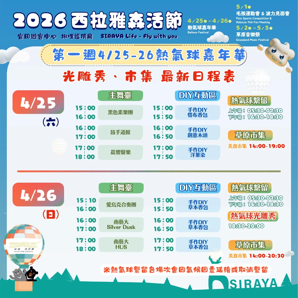 不過因最新氣象預報顯示25日天氣狀況不穩定,基於安全考量及整體視覺呈現品質,熱氣球光雕秀調整至4月26日(星期日)晚間7時於原地舉行;市集改至25日晚間7時、26日晚間8時30分登場。
