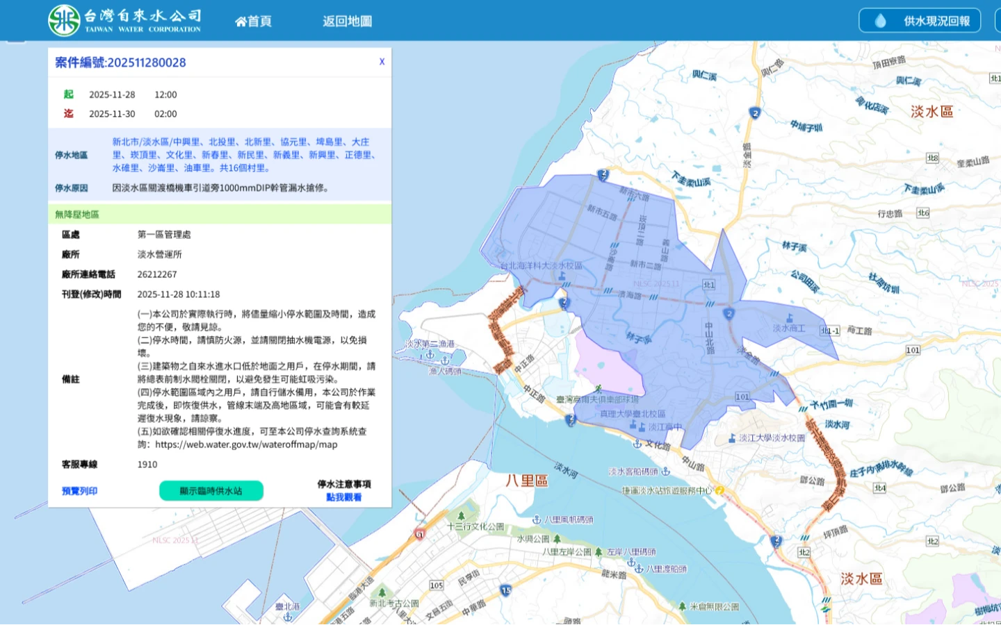 淡水區公所也在粉專公布「緊急停水公告」,因「淡水河北側沿河平面道路工程」主線高架P20基樁施工挖損導致破管,造成漏水並進行緊急搶修。請受影響的民眾提前儲水。如停水期間需要水車支援,可洽:台灣自來水公司第一區管理處淡水營運所電話:02-2621-2267或1910。