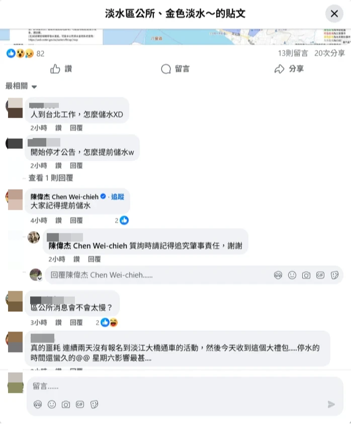 不過,不少在地人臨時才收到通知,根本來不及反應,頻頻在留言區抱怨,「人(已)到台北工作,怎麼儲水」、「回家都傍晚了,怎麼儲水」、「開始停才公告,怎麼提前儲水」、「區公所消息會不會太慢?」「真的噩耗 停水的時間還蠻久的@@ 星期六影響最甚....」。