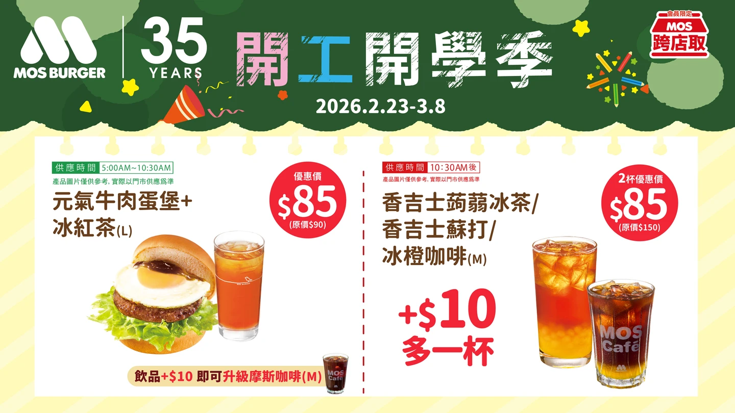 2月23日至3月8日摩斯漢堡推出一系列「開工開學」餐飲優惠。摩斯漢堡提供