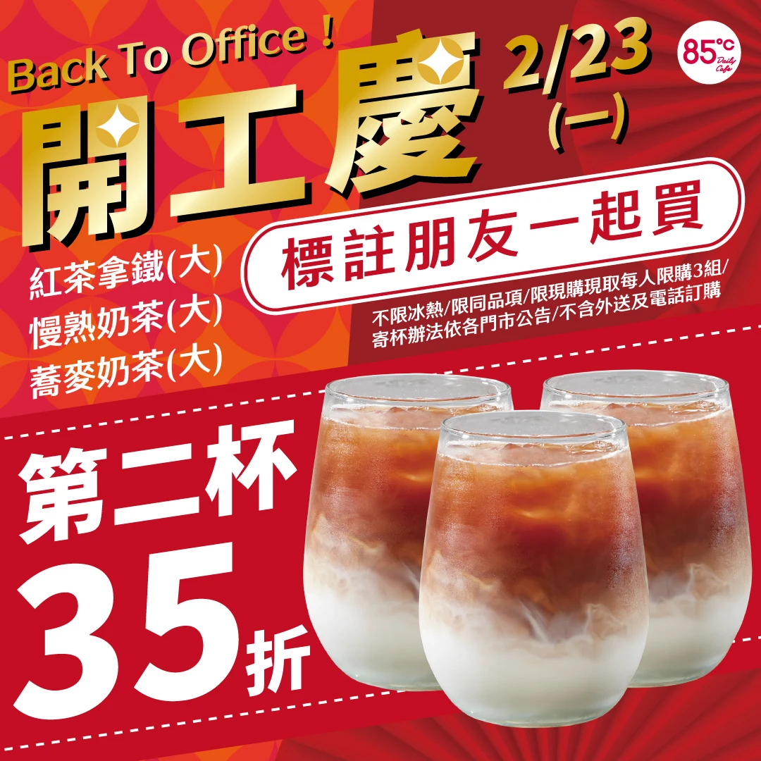 85℃ 2月23日推出大杯紅茶拿鐵、慢熟奶茶和蕎麥奶茶「第2杯特價3.5折」,其中「紅茶拿鐵」2杯大杯原價130元,活動特價87元;不喜歡鮮奶的人可以喝「慢熟奶茶」,2杯大杯原價100元,特價67元;擔心喝了會失眠的人可以選無咖啡因的「蕎麥奶茶」,2杯大杯原價100元,特價67元,優惠限同品項、不限冰熱、每人現購現取限3組,寄杯辦法依各門市公告為主,線上訂餐外送或外帶、電話訂購無此優惠。