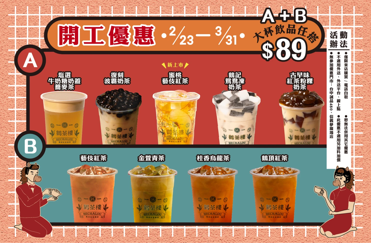 優惠內容 A+B大杯飲品任搭組合價89元 (限來店/電話自取)