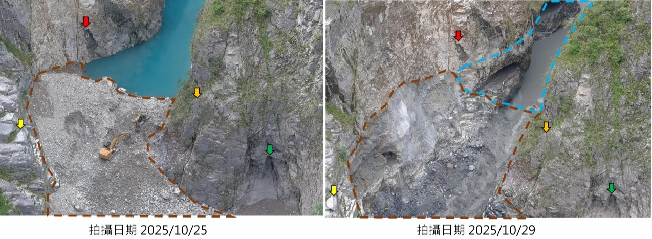 【記者盧麗蓮、陳亮諭/綜合報導】農業部林業及自然保育署今(29日)指出,花蓮立霧溪燕子口堰塞湖,昨(28日)因降雨,導致壩體原滲流處水量擴大並進一步沖刷壩體,今天湖水已引流至下游,緊急呼籲下游民眾及遊客切勿進入立霧溪河道及管制區。林業及自然保育署花蓮分署監測顯示,燕子口堰塞湖水位從潰決到12時10分,40分鐘內下降約18公尺;觀察發現,堰塞湖壩體已幾乎完全潰決,湖水全數傾瀉而下,但因為防範得宜,立霧溪下游人員與設施均安,這讓林保署鬆口氣,「連日的壩體降挖與引流作業,終於加大溢流,讓大自然的力量帶走堵住河道的壩體了。」