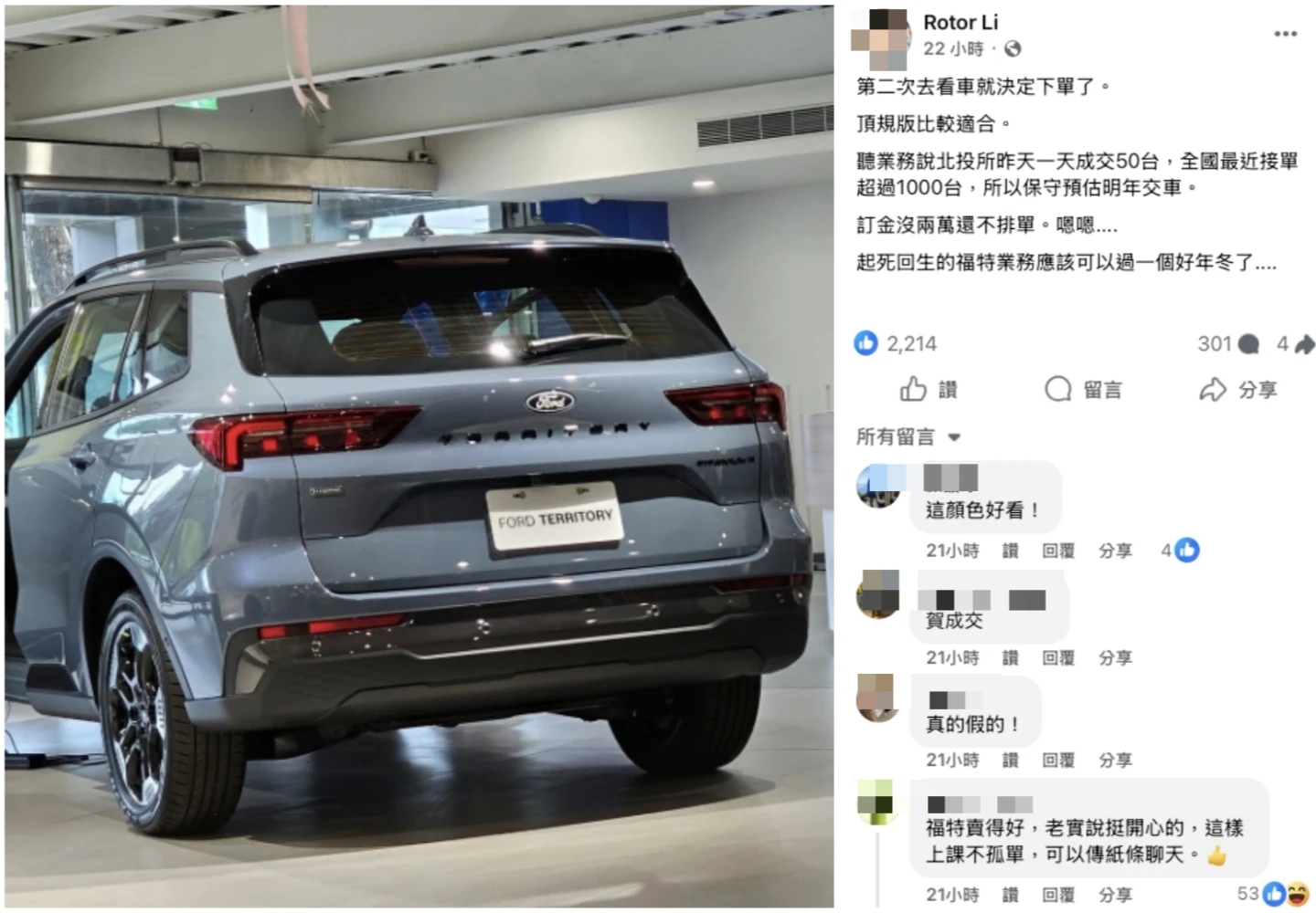 而臉書粉專「Ford Territory台灣車友俱樂部」裡準車主Rotor Li發文表示:「賀成交。第二次去看車就決定下單了。」他認為頂規版比較適合自己,聽業務員說,北投所一天成交50台,全國最近接單超過1000台,所以保守預估明年交車,「訂金沒兩萬還不排單。嗯嗯....起死回生的福特業務應該可以過一個好年冬了。」