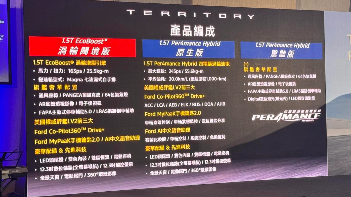 Territory Hybrid分為原生版(104.9萬元)與驚豔版(109.9萬元),兩者僅差五萬元,頂規卻增添多達12項配備,包括:LED貫穿識別燈、動態迎賓燈、腳踢感應電尾門、電子後視鏡、真皮方向盤、雙前座通風座椅、十向電調駕駛座、頂級Pangia皮革,以及六顆環車雷達(原生版四顆)。內裝採用雙 12.3吋數位螢幕,搭載8核心CPU與7奈米製程,並支援 Copy Link 手機投影功能。此外,它還具備舒適煞車功能,能有效抑制車輛停止時的回彈,提升乘坐舒適性。