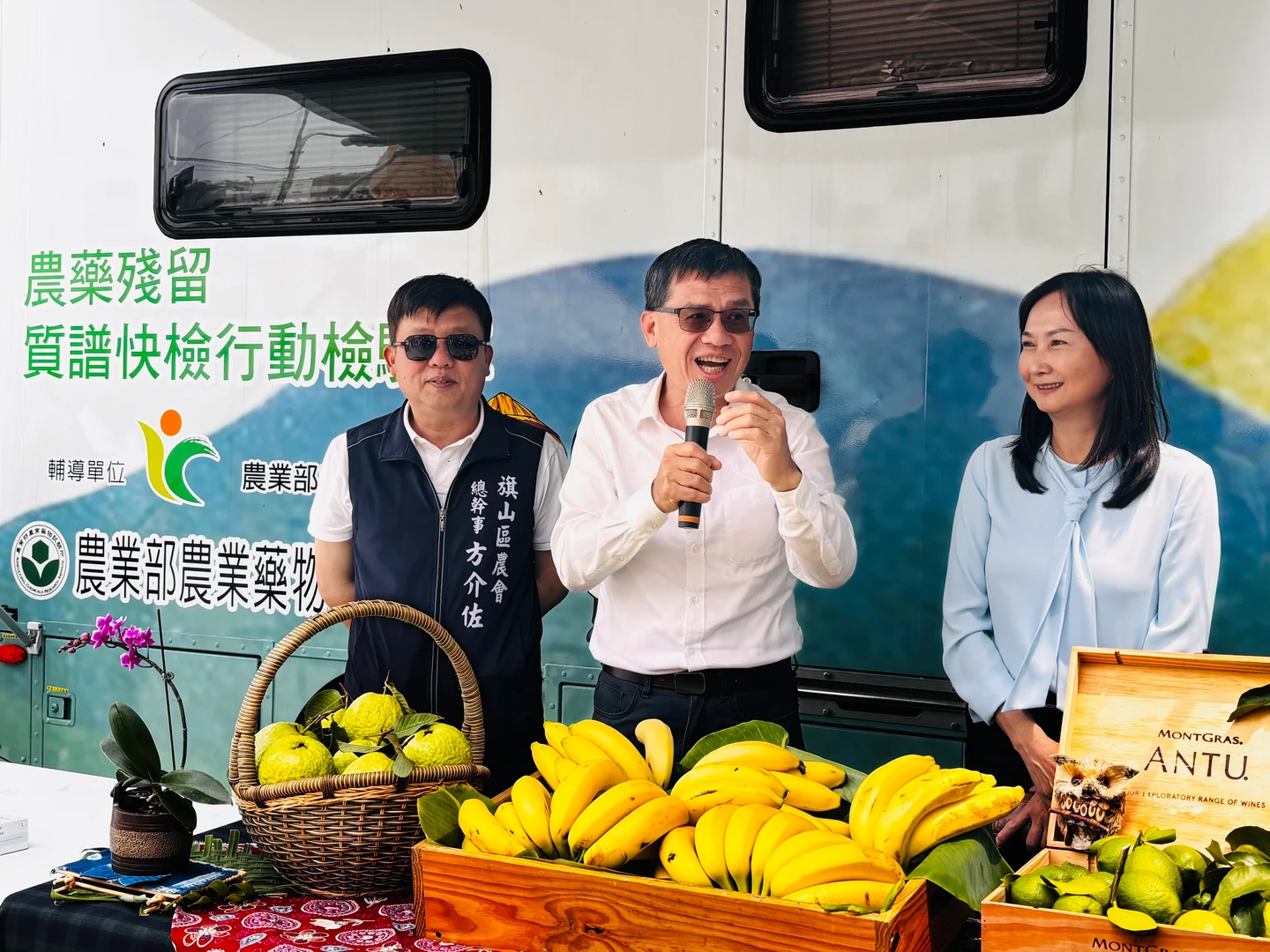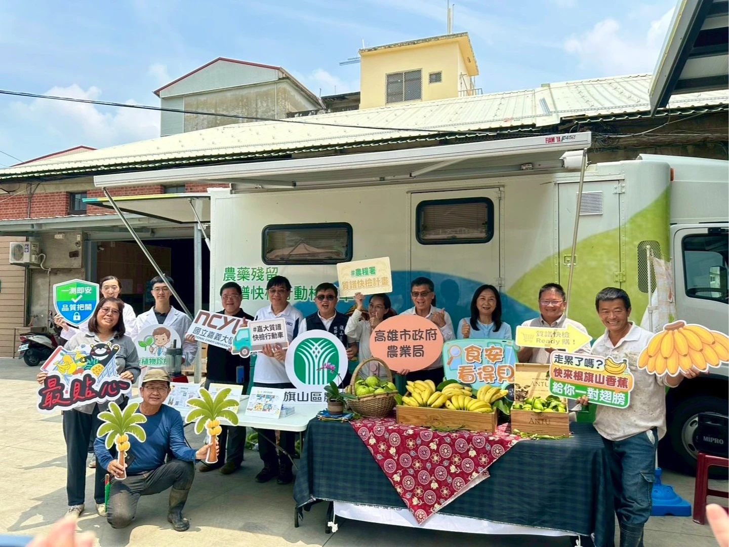 高市農業局上午偕同農業部農糧署、國立嘉義大學及旗山區農會等單位,在旗山農會肥料倉庫舉行啟動儀式。農業局指出,此次為行動質譜車首次深入旗山產區,透過行動檢測與精準篩檢,讓農民在產地即可完成送驗,縮短等待時間。