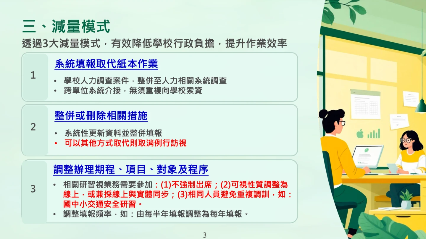 對於行政減量的模式,林伯樵說明,共有3種主要方式,首先是以系統填報取代紙本作業,像是學校人力調查案件,整併至人力相關系統調查,並讓跨單位系統介接,無須重複向學校索資。