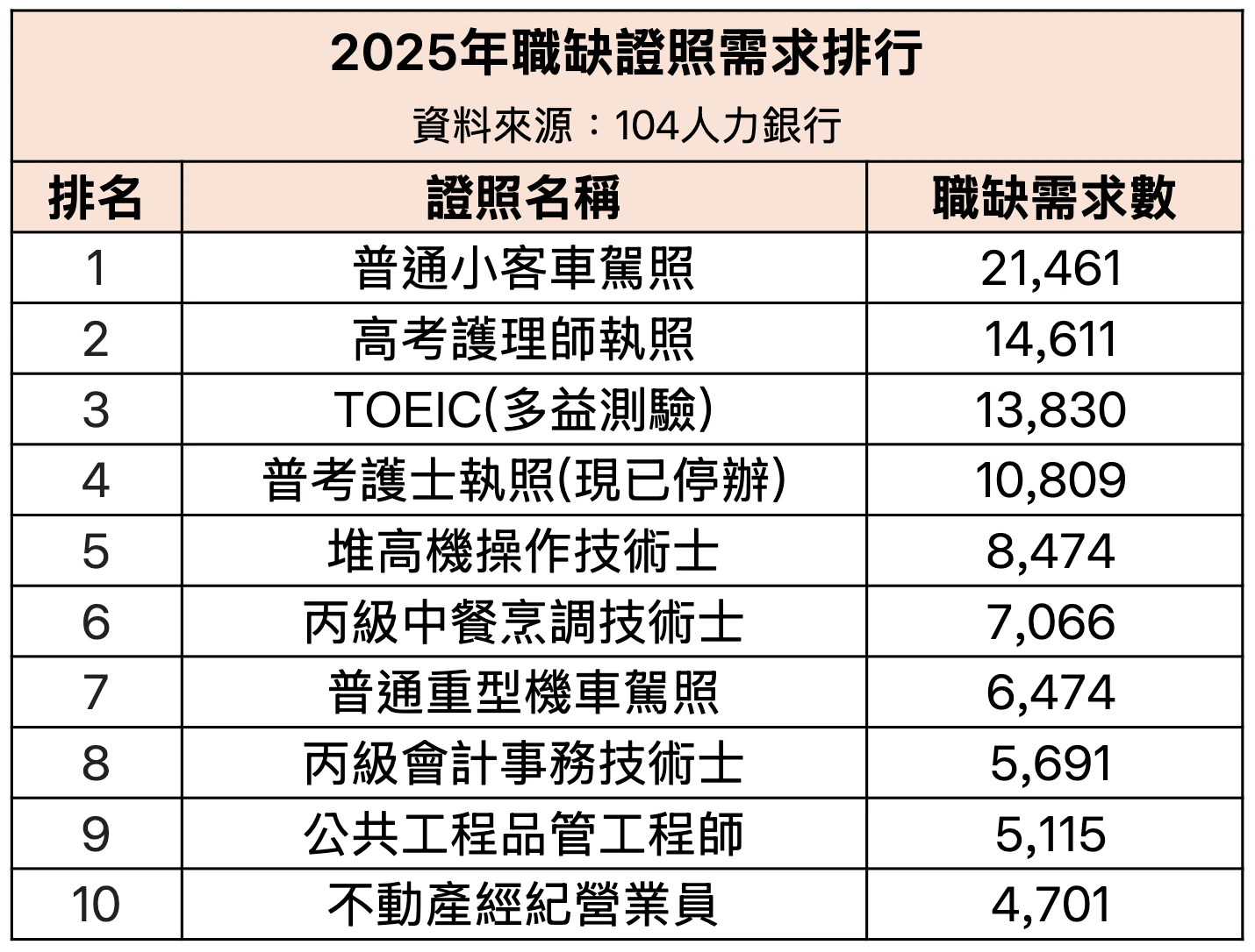 104人力銀行分析,從職缺需求證照前十名,可看出2類需求,一是實務操作與外勤能力,例如「堆高機操作」與「機車駕照」多見於物流、倉儲與外送等職務,二是特定領域基礎或法規門檻證照,如「公共工程品管工程師」是工程承攬單位需配置的專業人員,「不動產經紀營業員」是從事房仲服務須具備的法定資格之一,「丙級中餐」與「丙級會計」分別對應餐飲與基層財務需求,都是企業徵才常有的要求。