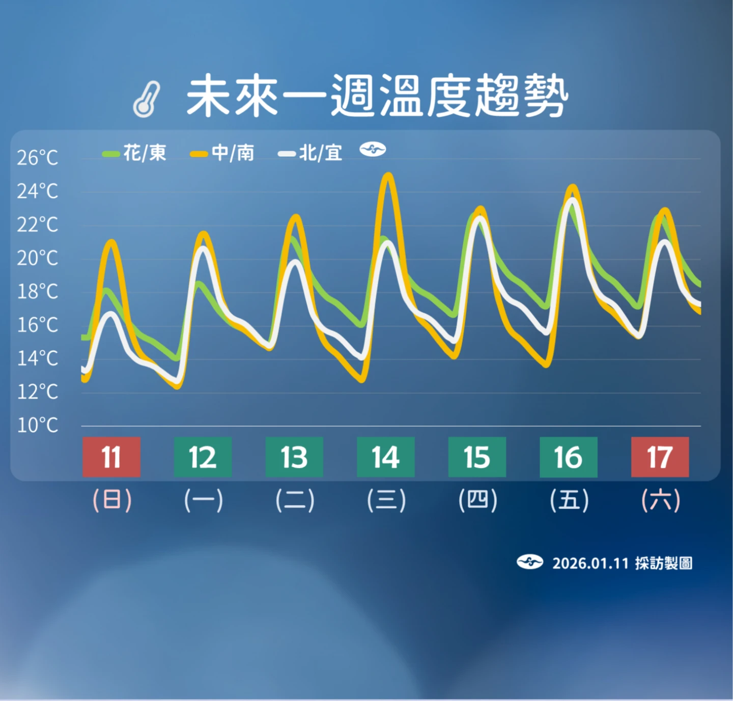 【記者陳力維/綜合報導】今(11)天清晨受大陸冷氣團及輻射冷卻影響,嘉義竹崎出現8.3度低溫,氣象署持續針對高雄以北等多地發布10度以下低溫特報。明日起冷氣團減弱,各地氣溫逐日回升,本周大多為多雲到晴,白天高溫可達20度以上,中南部甚至上看27度,感受溫暖如春,但因輻射冷卻效應,入夜與清晨仍寒冷,需注意劇烈日夜溫差。下半周菲律賓東方海面有熱帶擾動生成颱風的機率,雖直接侵台可能性低,但其間接影響仍待後續觀察。