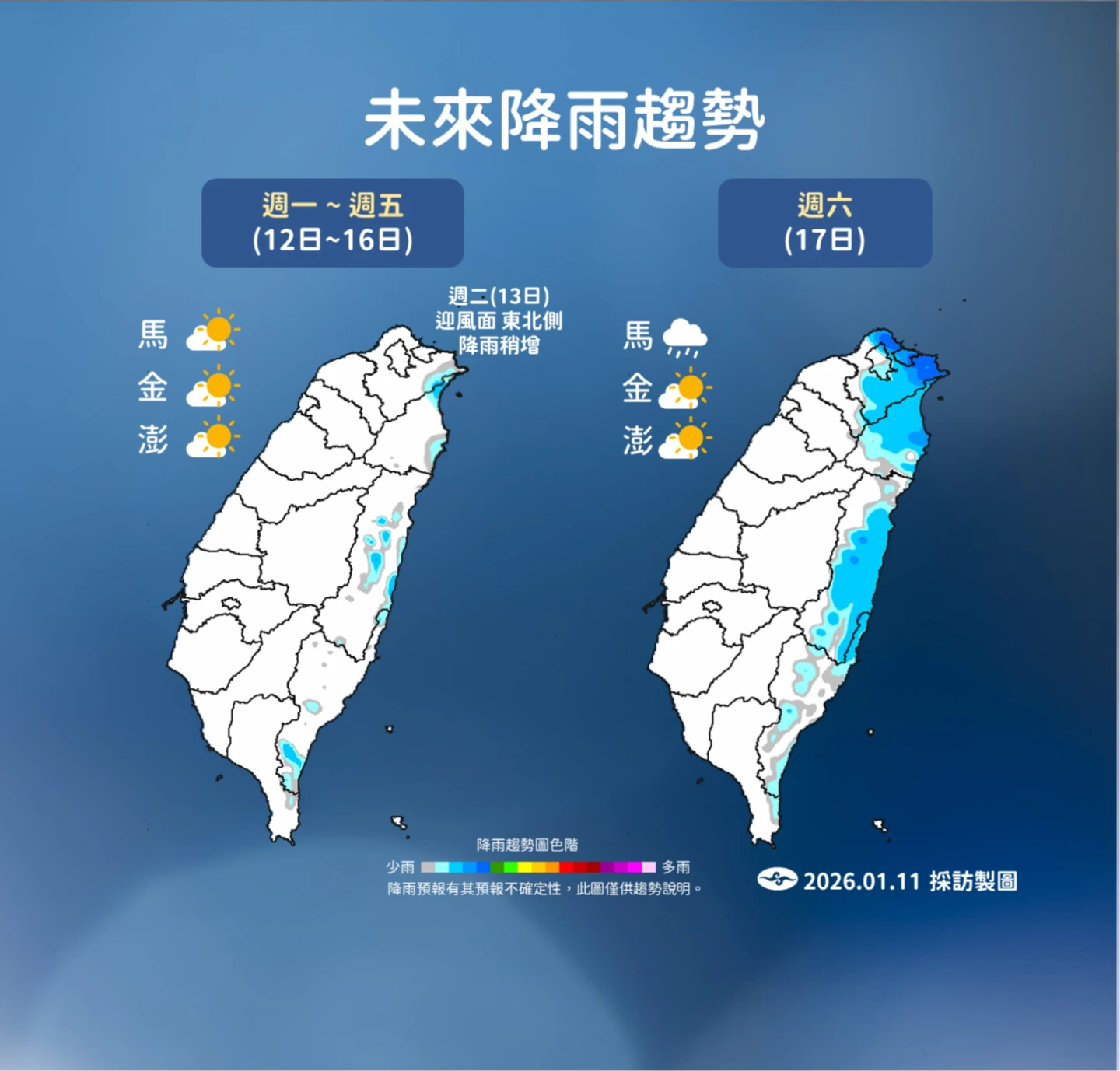 雖然清晨寒冷,但天氣型態即將轉變。林得恩表示,隨著強冷氣團暫時退場,明日(12日)白天起大陸冷氣團將減弱為「東北季風」等級,氣溫將一天比一天高。