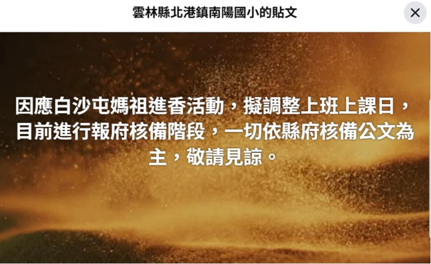 南陽國小表示,因應白沙屯媽祖進香活動,擬調整上班上課日,目前進行報府核備階段,一切依縣府核備公文為主。