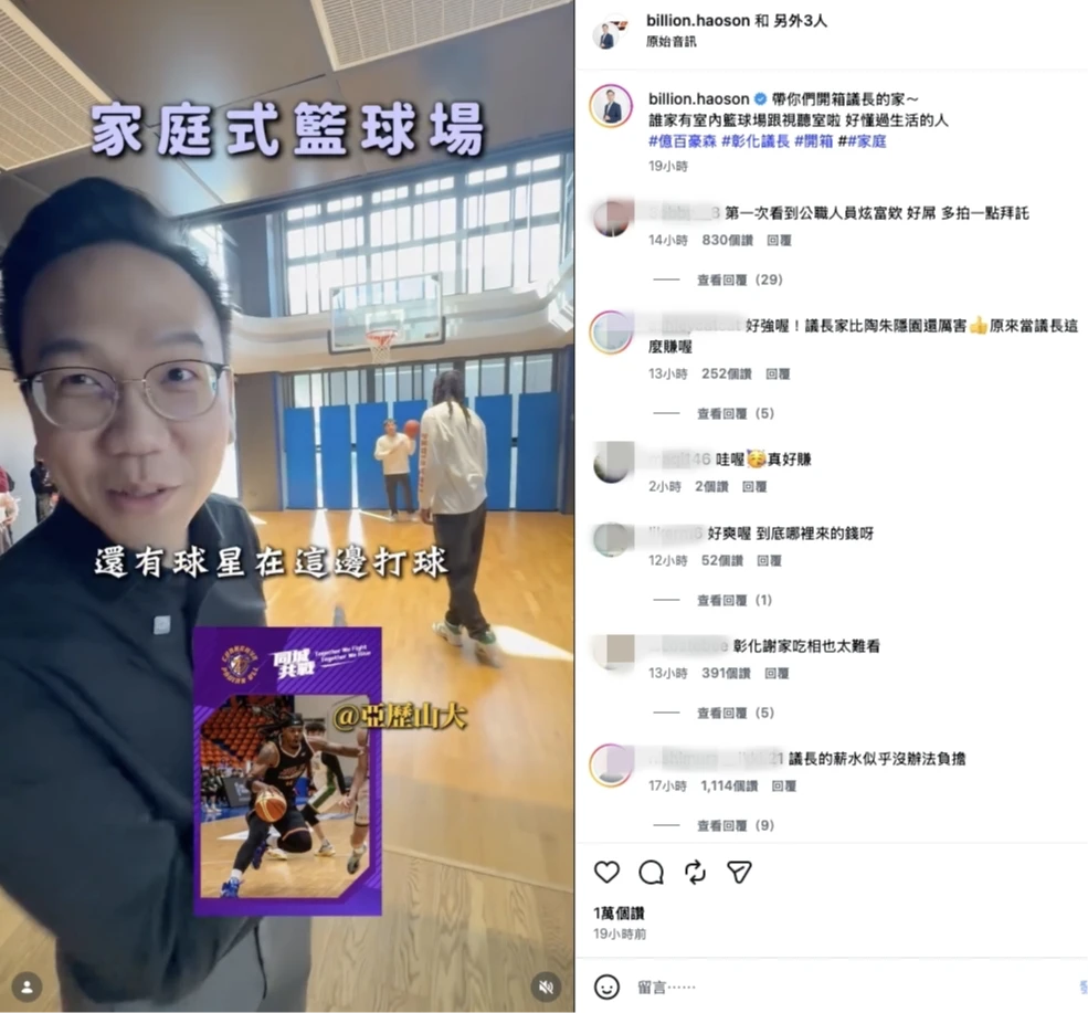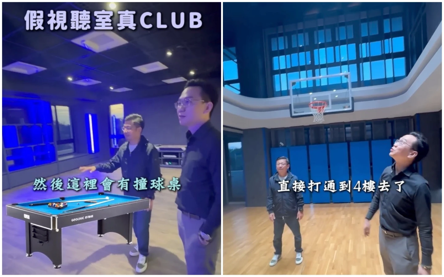 隨著YT頻道「億百豪森」的鏡頭深入屋內,謝家豪華設施逐一展現在觀眾眼前。客廳採挑高設計,旁邊設有一整排具備恆溫、恆濕功能的超大酒櫃,約可存放300至400瓶酒。最令人震驚的是,豪宅3樓竟然建有一座挑高的「室內籃球場」,空間直接打通至4樓,影片中甚至有疑似職籃球員正在場內練球。謝典霖表示,這是為了讓喜歡打球的兒子能在家運動,把家裡當成有趣的地方。此外,屋內還設有配備撞球檯與巨型投影幕的視聽室,以及極為寬敞的浴室大浴缸。
