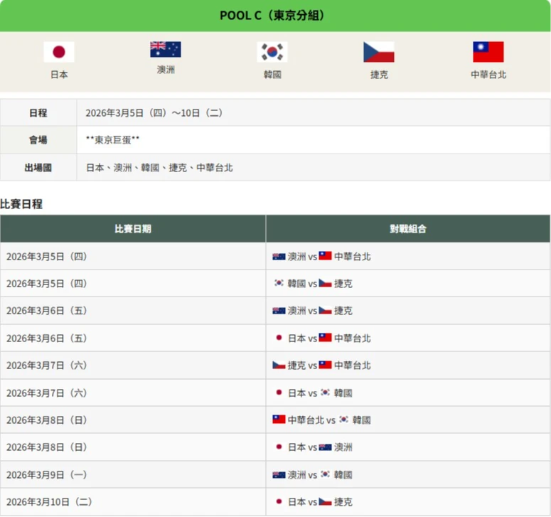 C 組:中華隊、日本、韓國、澳洲、捷克