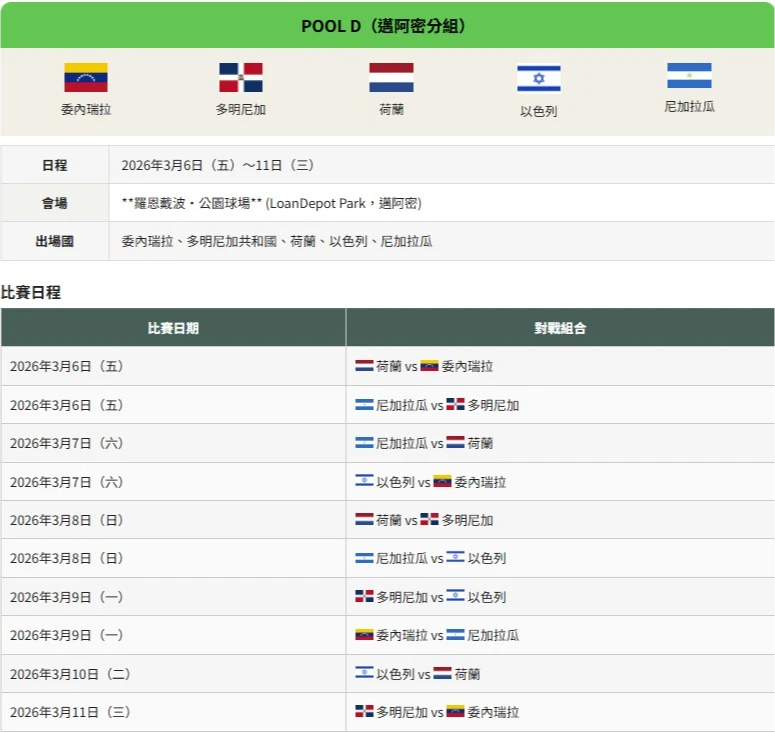 D 組:委內瑞拉、多明尼加、荷蘭、以色列、尼加拉瓜