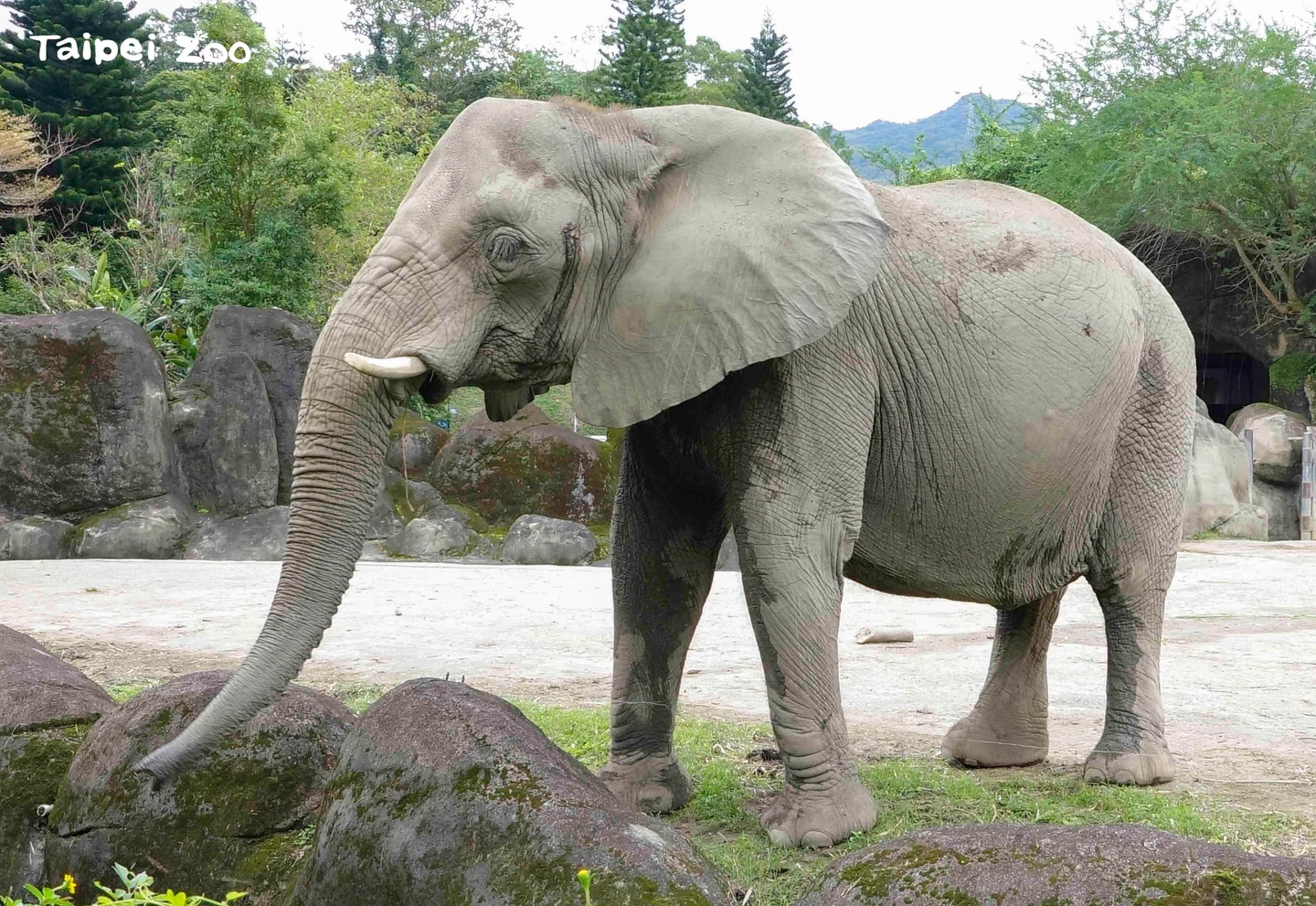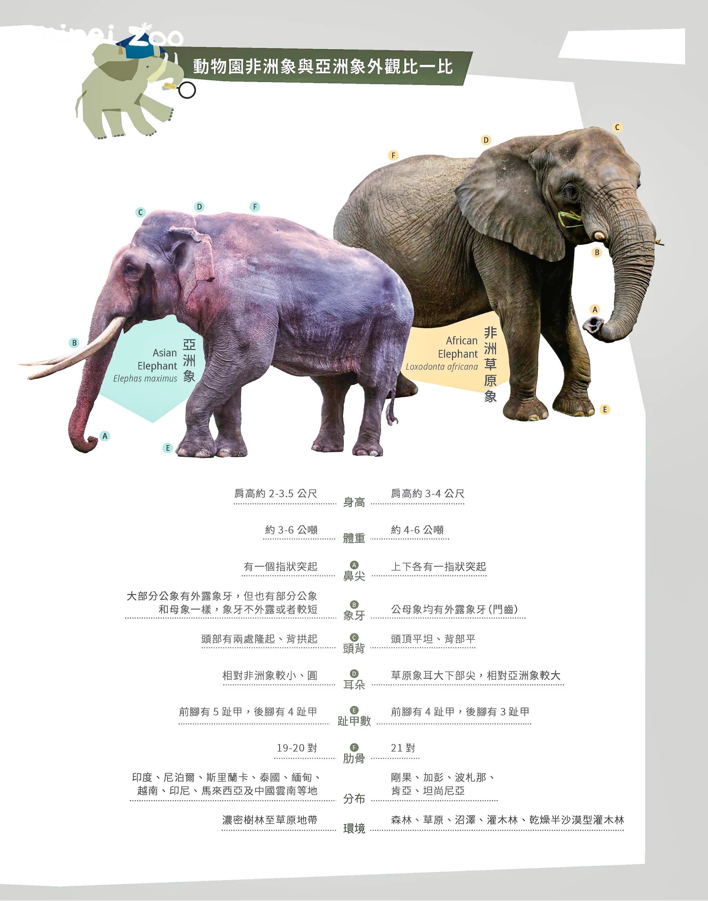 北市立動物園目前同時照養了亞洲象和非洲草原象,可從象鼻鼻尖、象牙、頭部及背部的形狀和前後腳的趾甲數量等來區分。