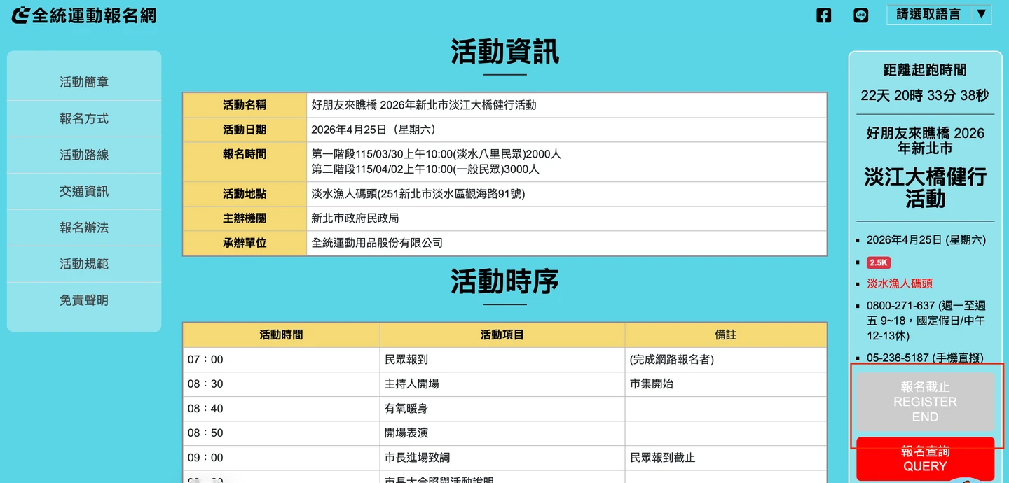 民政局指出,健走活動共計開放5000名額報名,第一階段於3月30日上午10時,優先開放「淡水」與「八里」地區2000位在地民眾報名,第二階段則於今天(4月2日)上午10時,開放全國3000位一般民眾報名,詳細活動資訊以及報名可上「全統運動報名網」查詢。