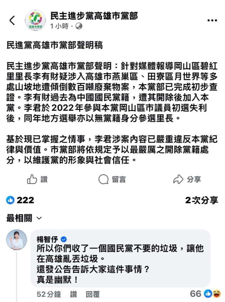 民進黨高雄市黨部表示,針對媒體報導李有財疑涉入高雄市燕巢區、田寮區月世界等多處山坡地遭傾倒數百噸廢棄物案,本黨部已完成初步查證。基於現已掌握之情事,涉案內容已嚴重違反本黨紀律與價值。將依規定予以最嚴厲之開除黨籍處分,以維護黨的形象與社會信任。