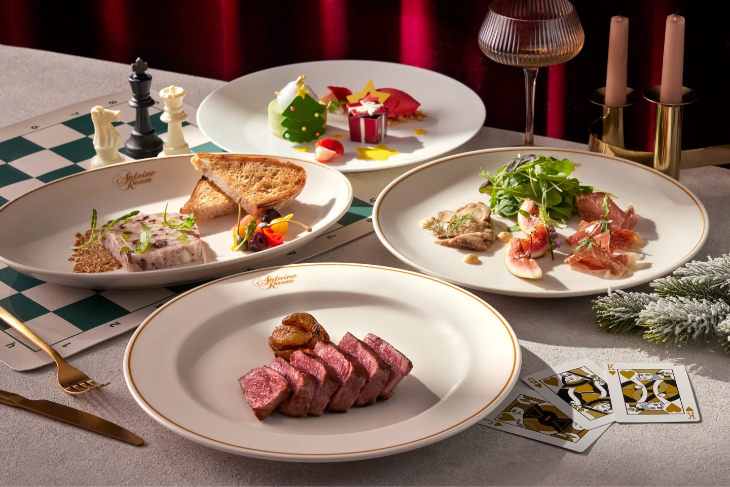 館內「安東廳牛排館」於12月24日及12月25日晚間推出「放玩聖誕饗宴」,每套3,680元+10%起。前菜以「炙燒海鱺魚」、「香煎日本北海道干貝」及「至尊奧實嘉魚子醬」等7道佳餚揭開序幕,湯品有聖誕限定「和牛蔬菜湯」、招牌「經典干邑風味龍蝦濃湯」與「蘑菇卡布奇諾湯」供選擇。