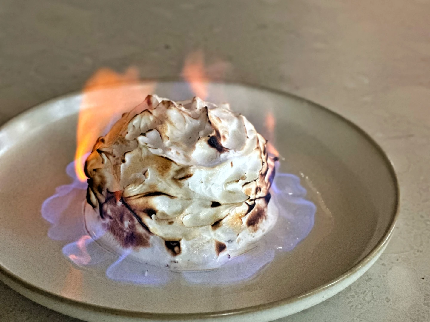最後以視覺系甜點「火焰阿拉斯加520元」,層層堆疊海綿蛋糕、冰淇淋及蛋白霜,上桌前澆淋橙酒上演火焰秀,享受到鬆軟蛋糕、冰淇淋和蛋白霜外熱內冷的口感層次。