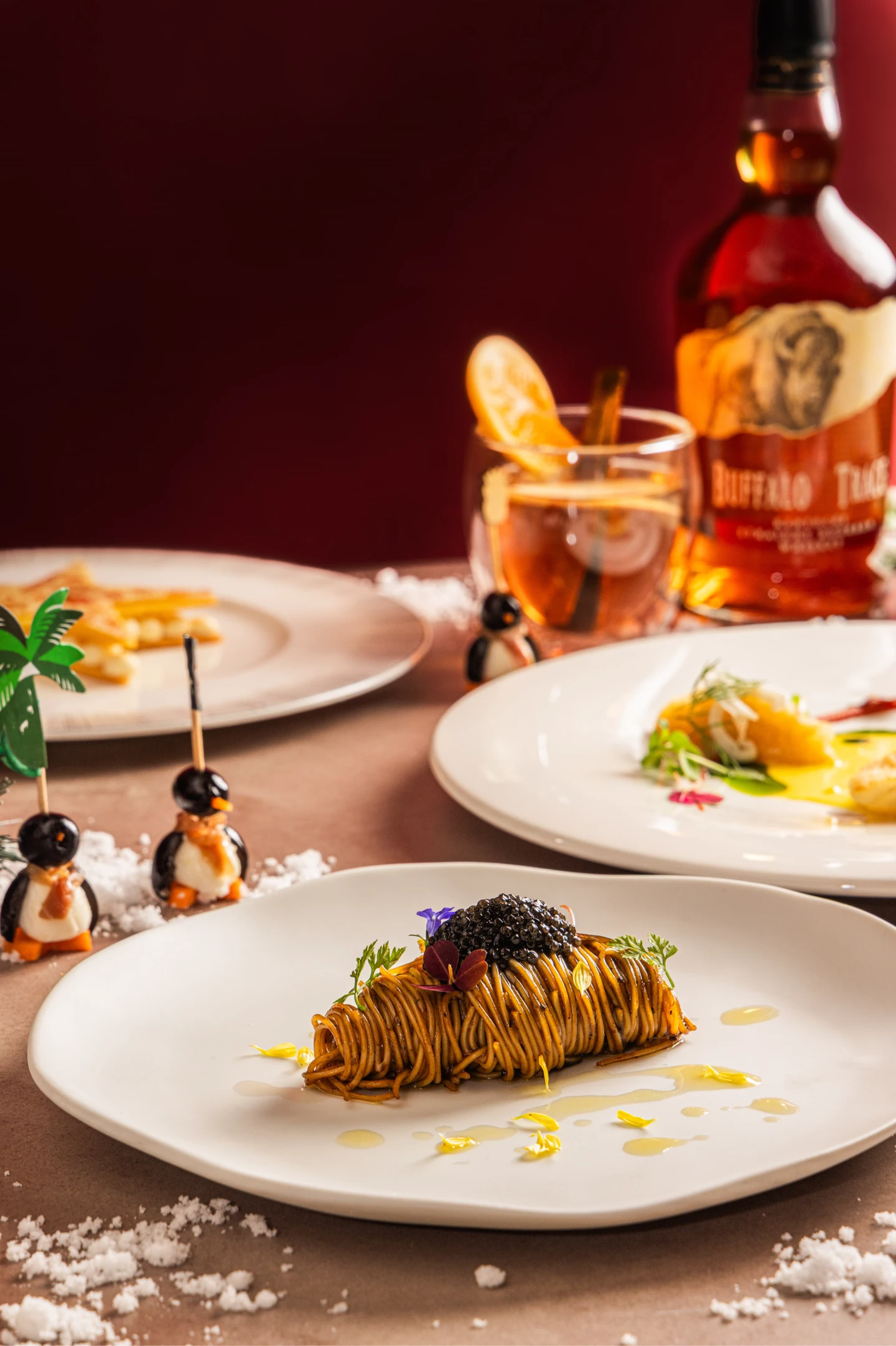 12月24日及25日聖誕限定,「寶艾西餐廳」推出以吸睛南極小企鵝、南瓜火雞濃湯囊括火燒栗子與羊肚菌、魚子醬天使髮麵佐黑松露昆布醬汁、聖誕火雞鴨肝奶油飯,主餐任選「鐵板煎夏多布里昂菲力牛排」或「煙燻薑餅屋比目魚菲力」、甜點以薑味檸檬餡與百香果醬沙布收尾,每套4,680元起。