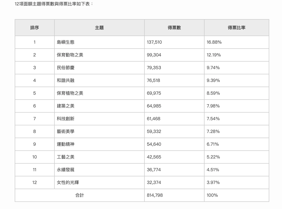 票選第6名至12名主題則依序為建築之美、科技創新、藝術美學、運動精神、工藝之美、永續發展及女性的光輝。總統賴清德拋出500元票券圖案想換成世界盃棒球賽12強,不過「運動精神」主題僅排第9名。