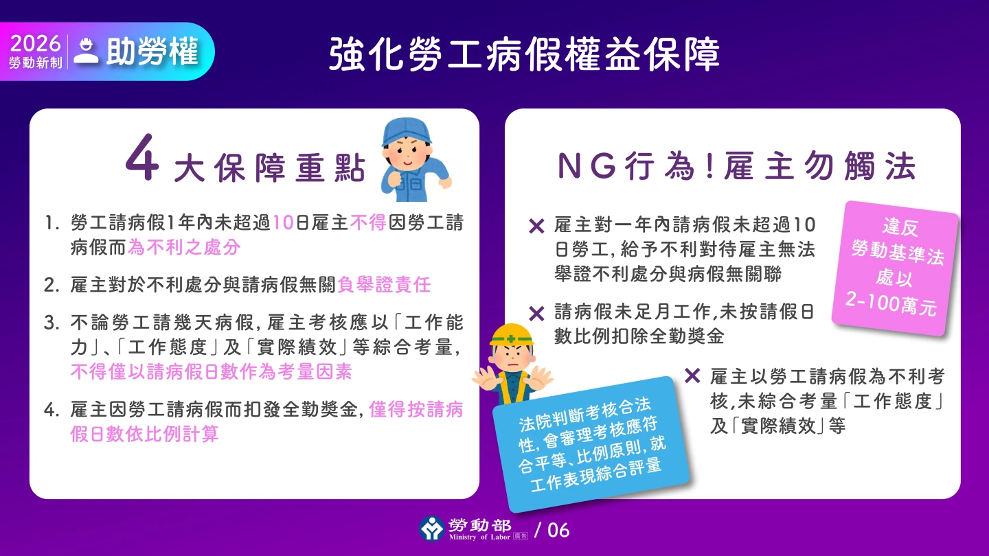 助勞權部分,黃琦雅說,為了讓勞工「真的敢請病假」,元旦起勞工1年內請病假未超過10日,雇主不能因此給予不利處分,即使病假超過10天,也不能單以勞工請病假來考核,且請病假不能扣發全部的全勤獎金,要按請病假日數依比例計算。